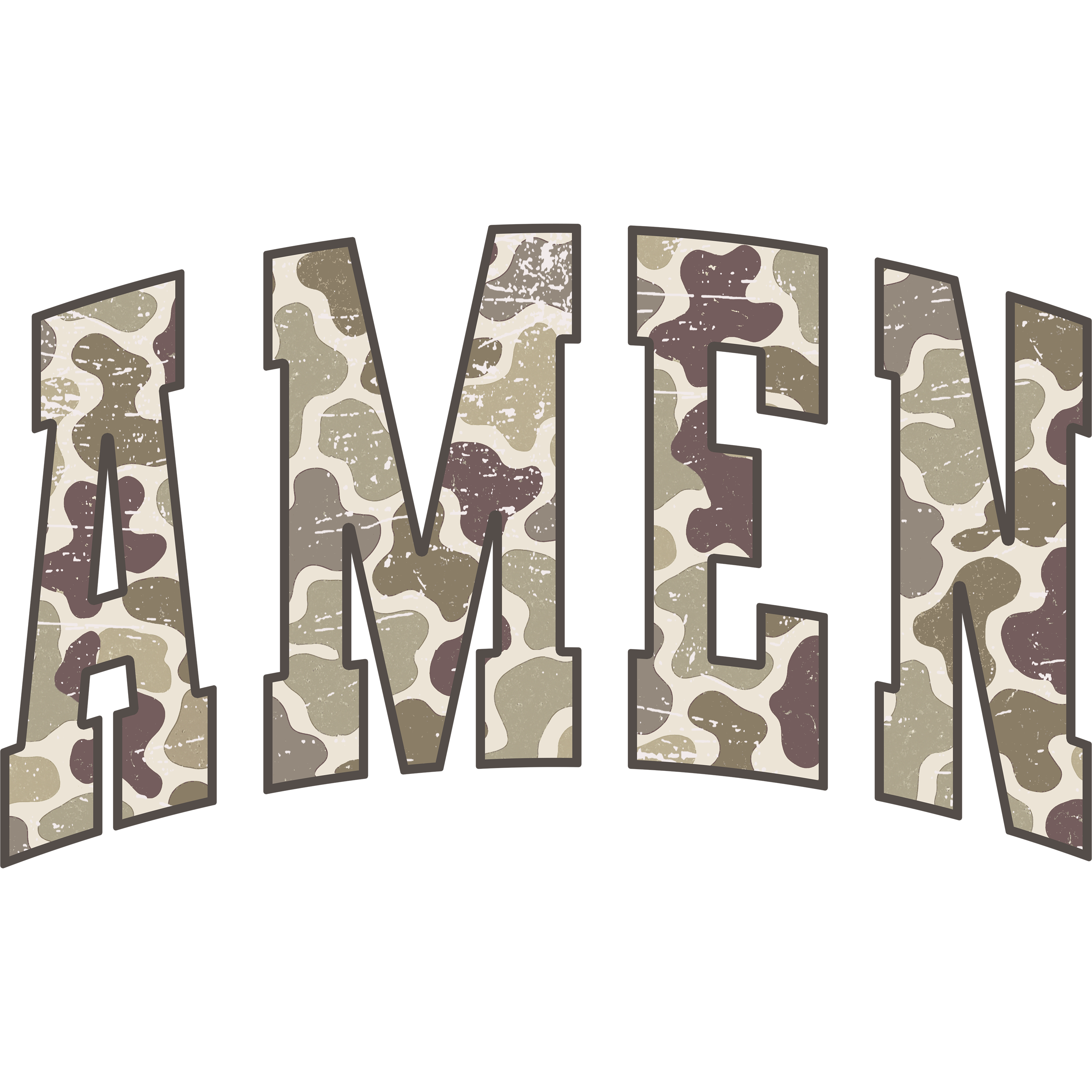 Say it loud and proud! ππ² Our Camo "Amen" DTF heat transfer is a bold and rugged statement of faith, perfect for the outdoorsman, hunter, or anyone who loves a touch of rustic style. This design features the powerful word "AMEN" filled with a classic camouflage pattern and finished with a distressed, weathered texture for that perfect lived-in look.