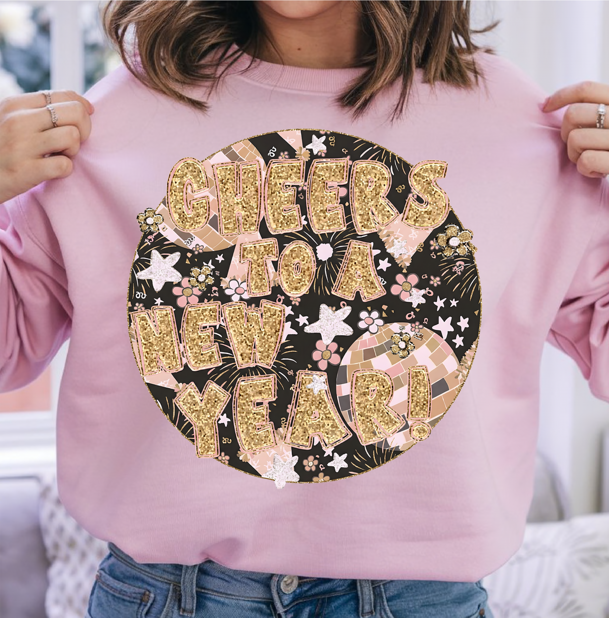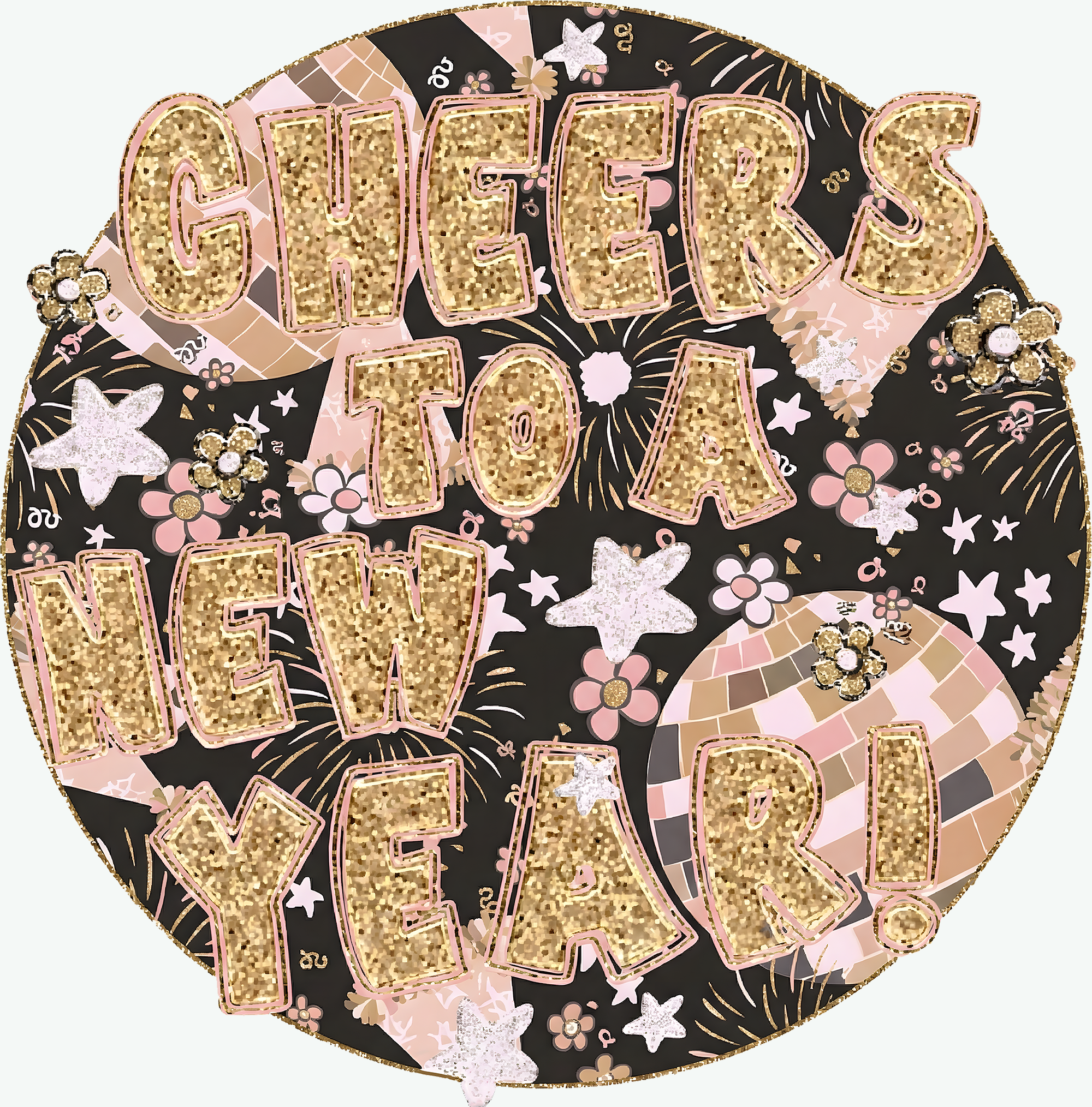 Get ready to toast to new beginnings with this dazzling "Cheers to a New Year!" DTF transfer. Featuring incredible faux gold glitter details, retro groovy flowers, stars, and party-ready disco balls against a chic dark background, this design is the ultimate way to say goodbye to the old and hello to the new.