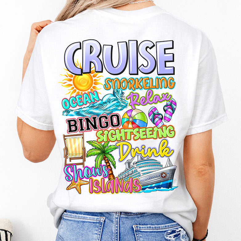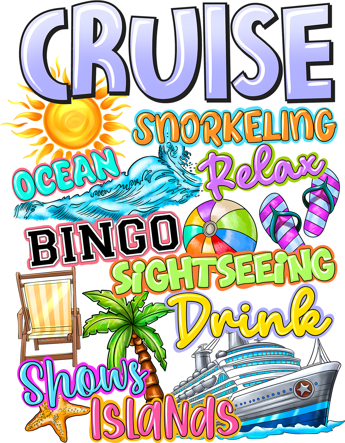 The Perfect Blend of Tropical Fun and Vacation Vibes Upgrade your travel apparel with a massive splash of color. Our Cruise Vacation Typography DTF transfer features an eye-catching, retro-inspired collage of cruising essentials. Highlighting fun keywords like Snorkeling, Bingo, Relax, and Sightseeing alongside playful illustrations of a cruise ship, palm tree, and ocean waves, this design is the ideal choice for families, travel groups, or anyone ready to hit the high seas and celebrate their vacation with a custom look.