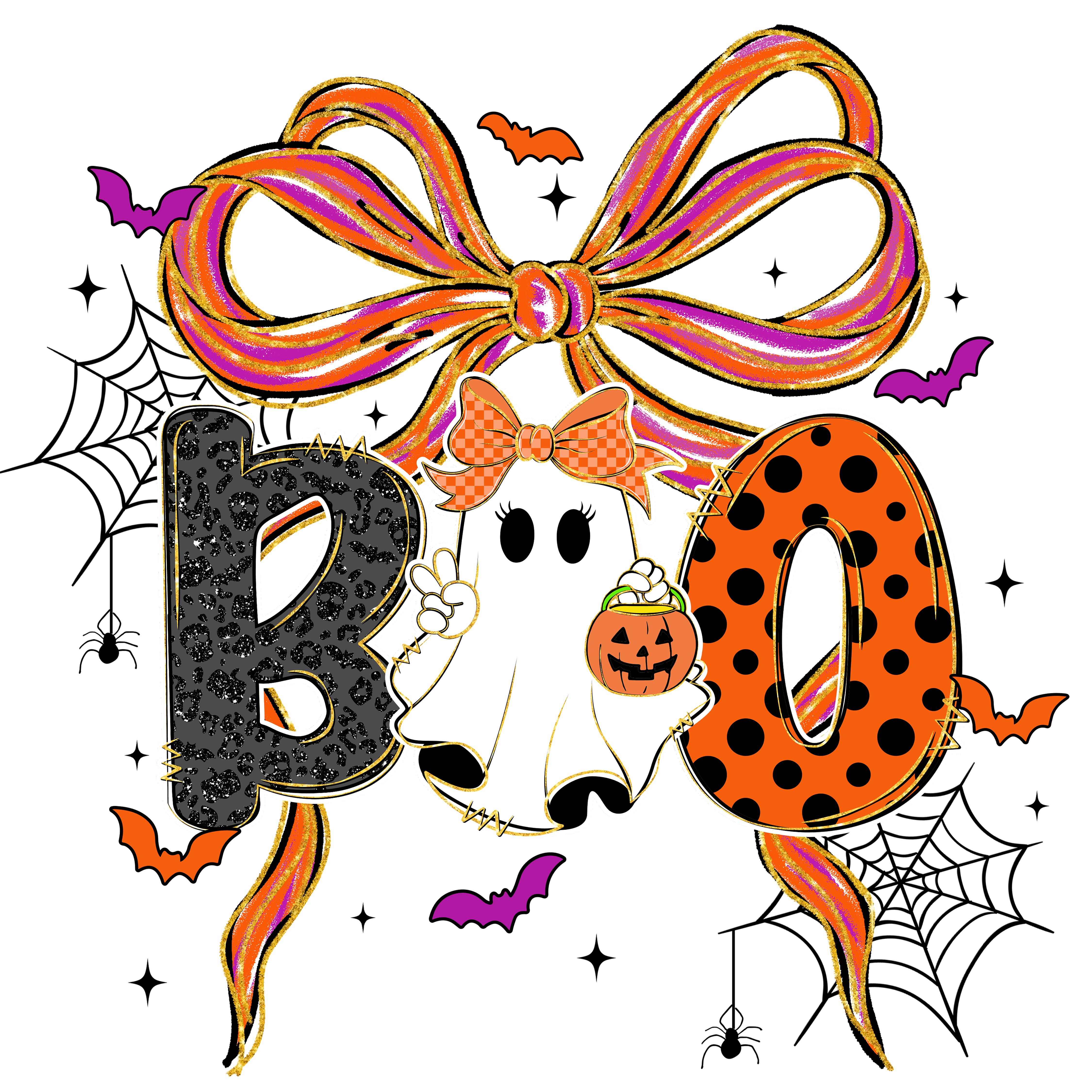 This adorable design is loaded with trendy details. A friendly ghost, complete with a checkerboard bow and a peace sign, takes center stage. The letters feature a fun mix of black glitter leopard print and orange polka dots, all tied together with a sparkling, oversized bow. It's the ultimate statement piece for a fun, girly, and fashionable Halloween!