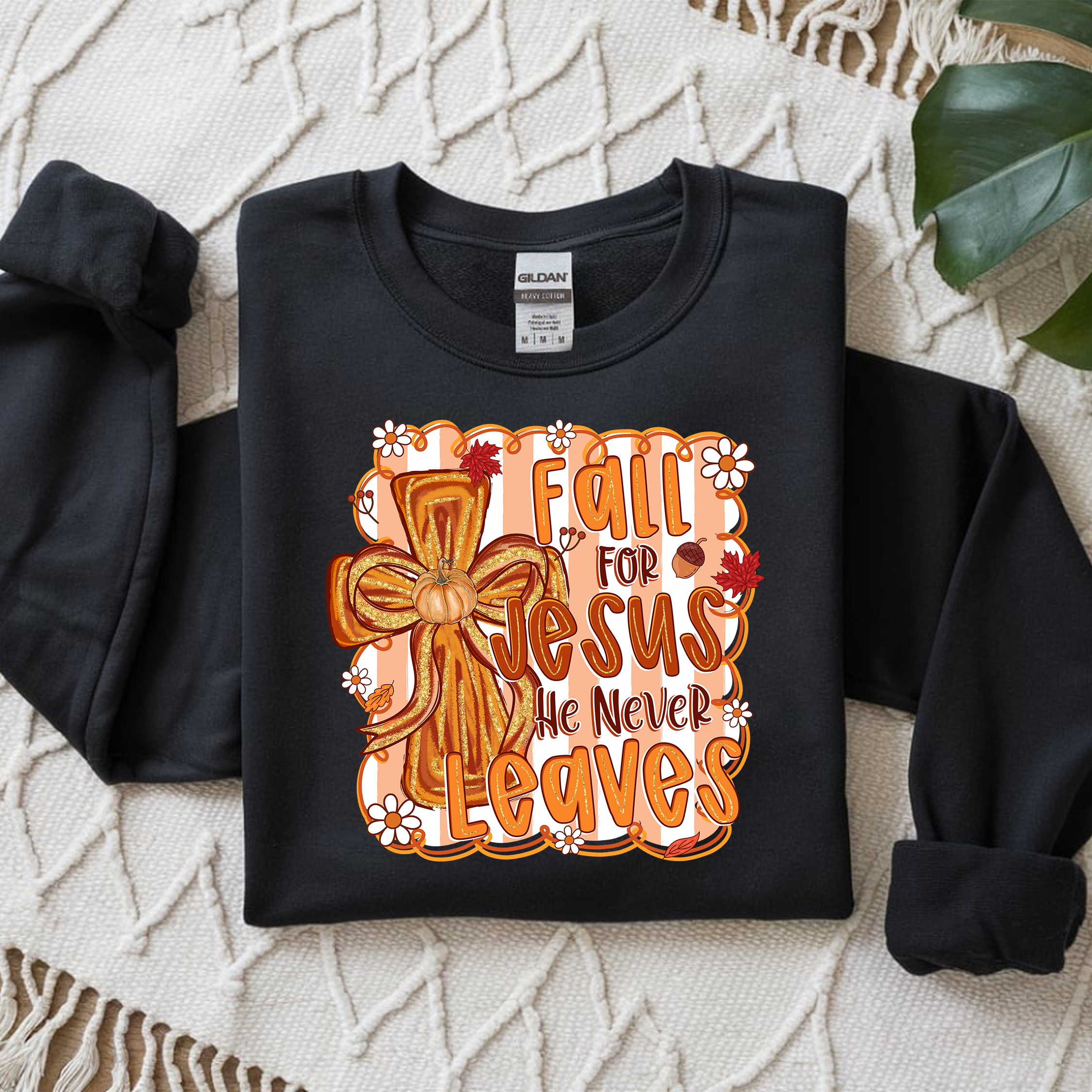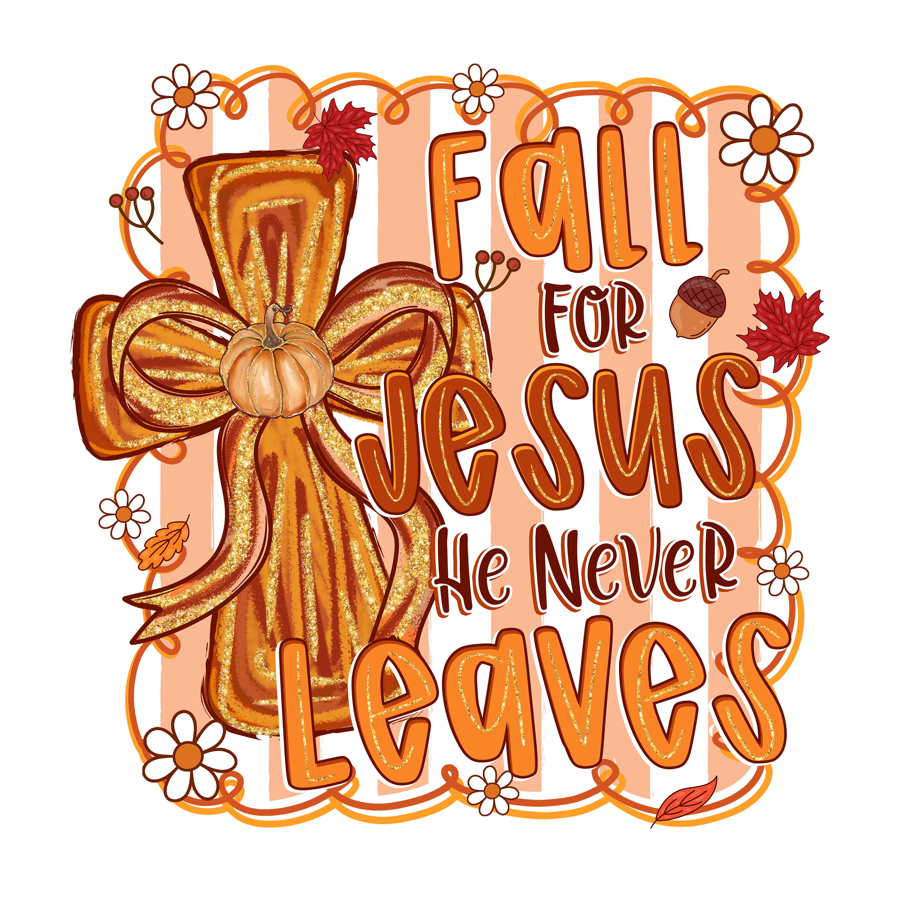 Celebrate a season of gratitude and a love that never fades! ππ§‘ Our "Fall for Jesus, He Never Leaves" DTF heat transfer is a joyful and vibrant expression of faith, perfect for the cozy autumn season. This beautiful design is packed with sparkling details, from the glittery cross wrapped in a pumpkin bow to the cheerful fall leaves and flowers.