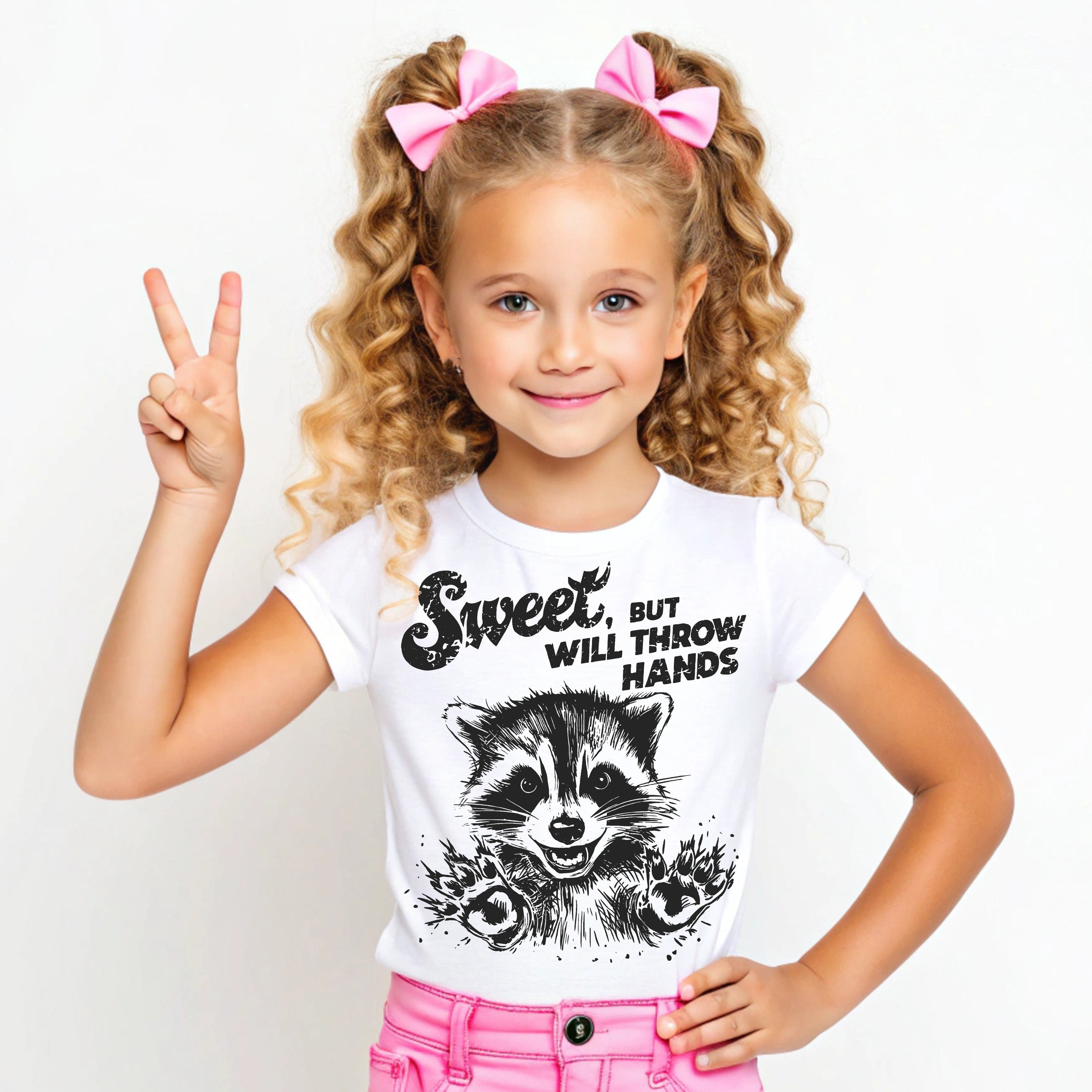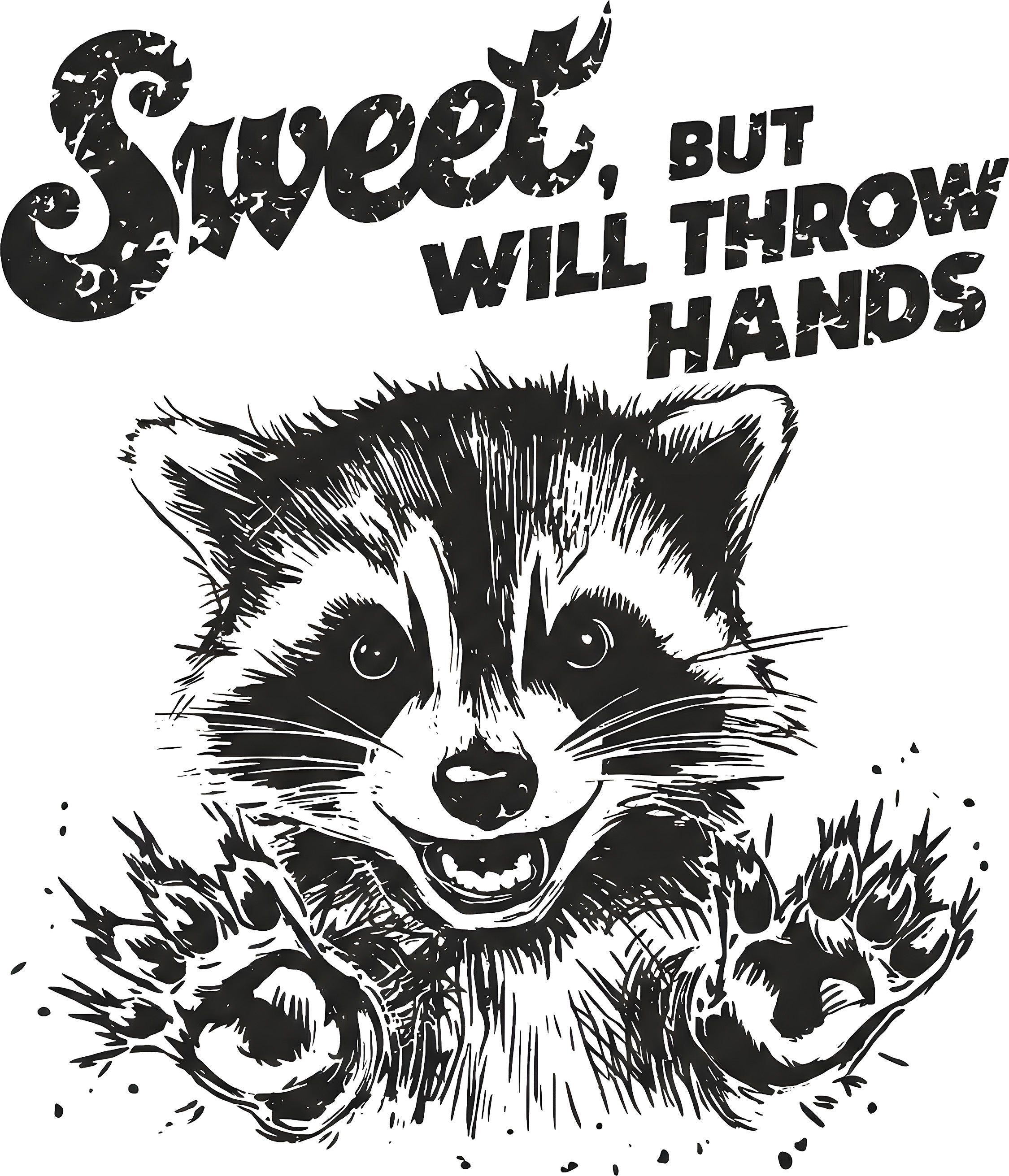 This funny and edgy transfer features a sketch-style illustration of a raccoon looking innocent... except for those claws ready for action! Above the critter, the text reads "Sweet," in a fancy script font, followed by the punchline "BUT WILL THROW HANDS" in bold, distressed block letters. The grunge texture gives it a cool, worn-in look that pairs perfectly with casual tees and hoodies. 🖤🐾