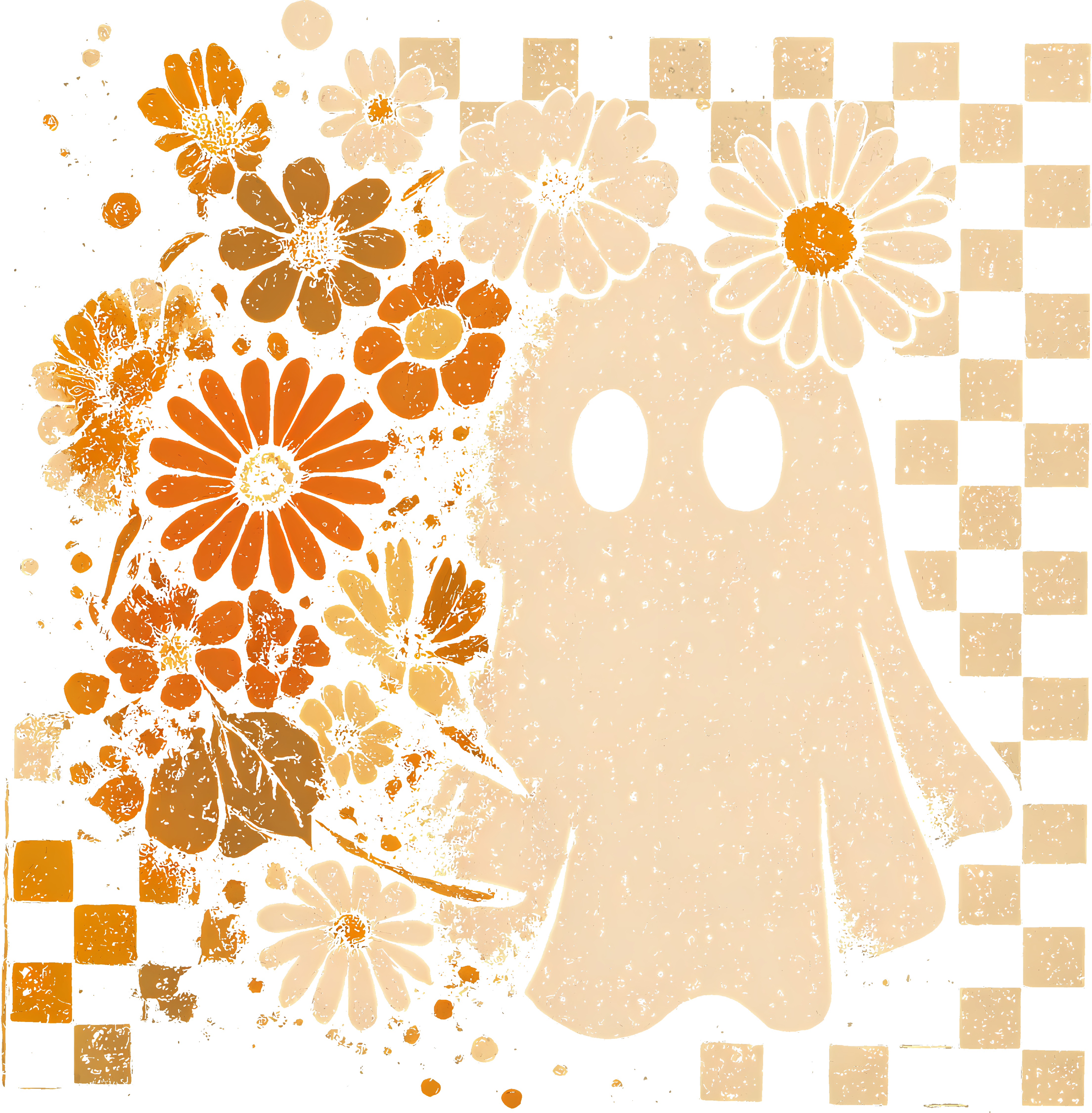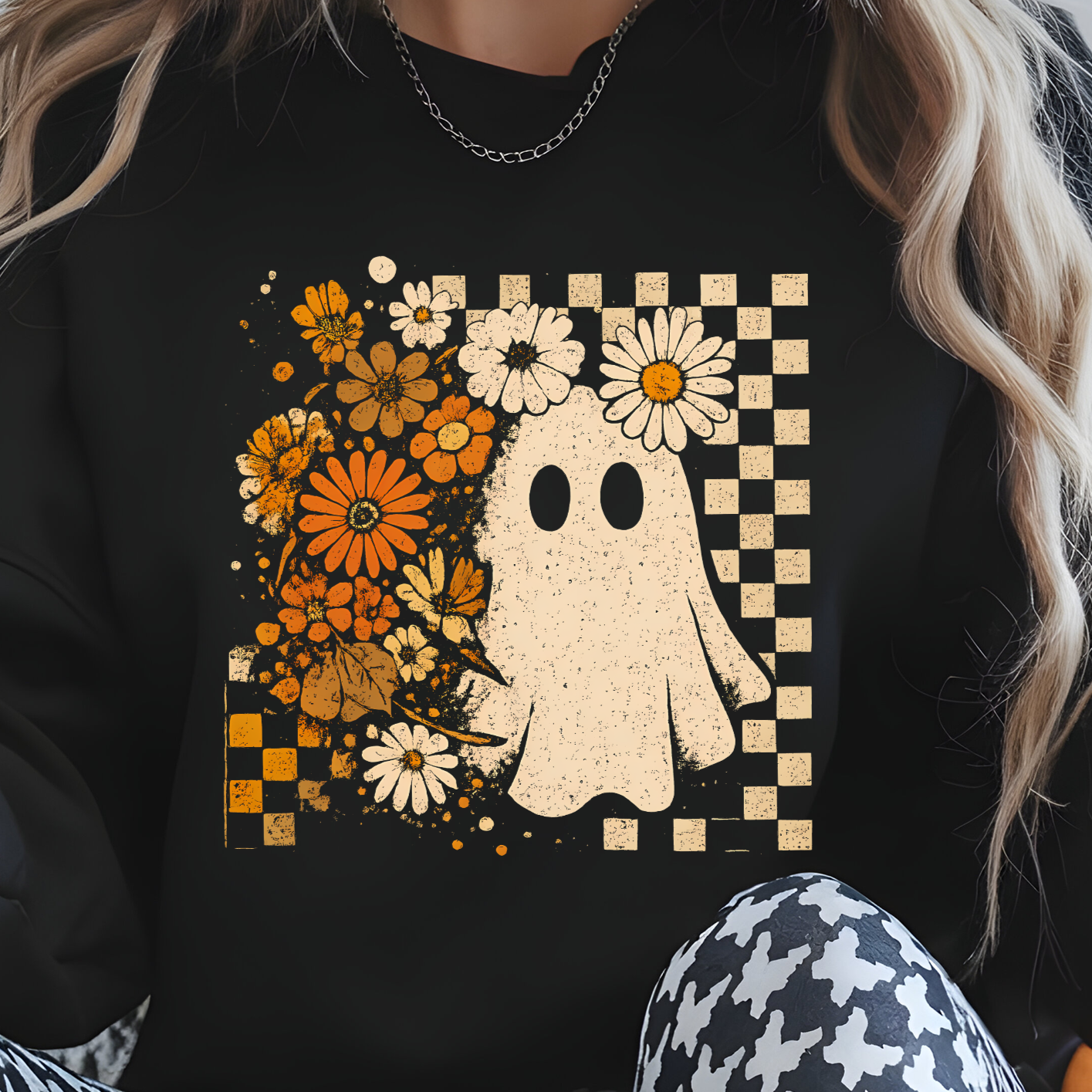 This DTF transfer combines retro florals with a spooky spirit for a look that's totally unique. A friendly, distressed-style ghost peeks out from a vibrant bouquet of daisies and autumn flowers, set against a classic checkerboard background. It’s the perfect design for anyone who loves a vintage, 70s-inspired aesthetic with a fun Halloween twist.