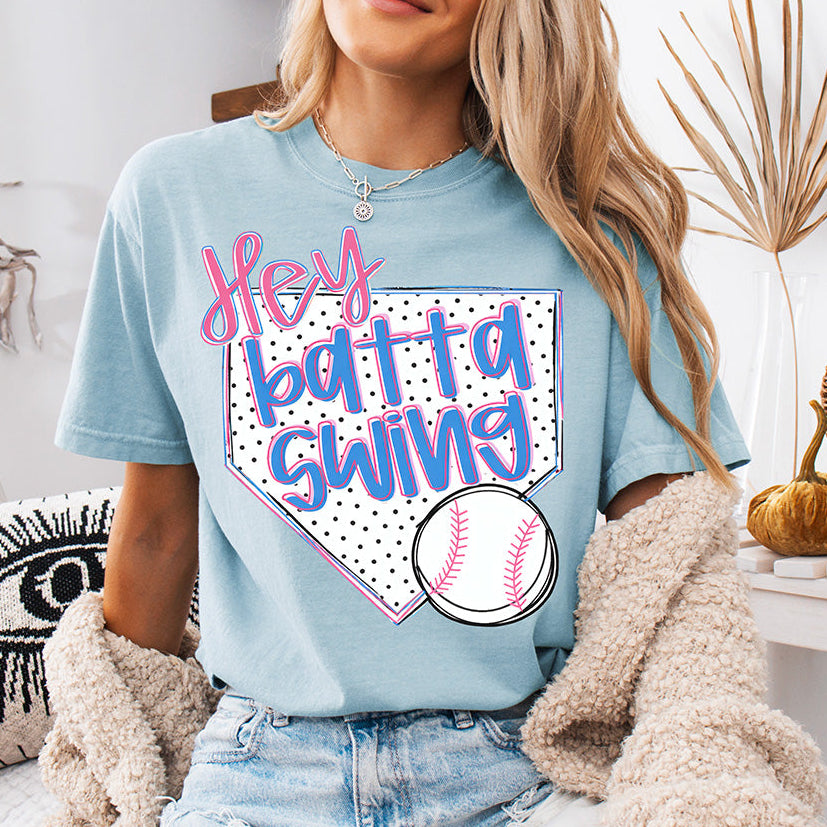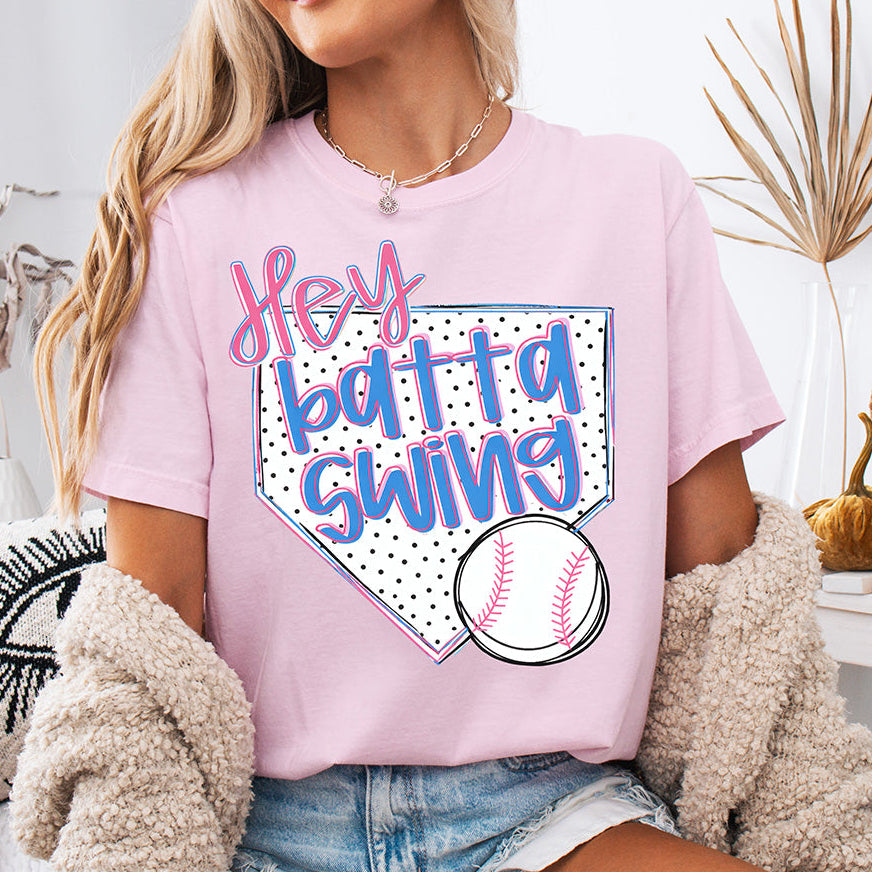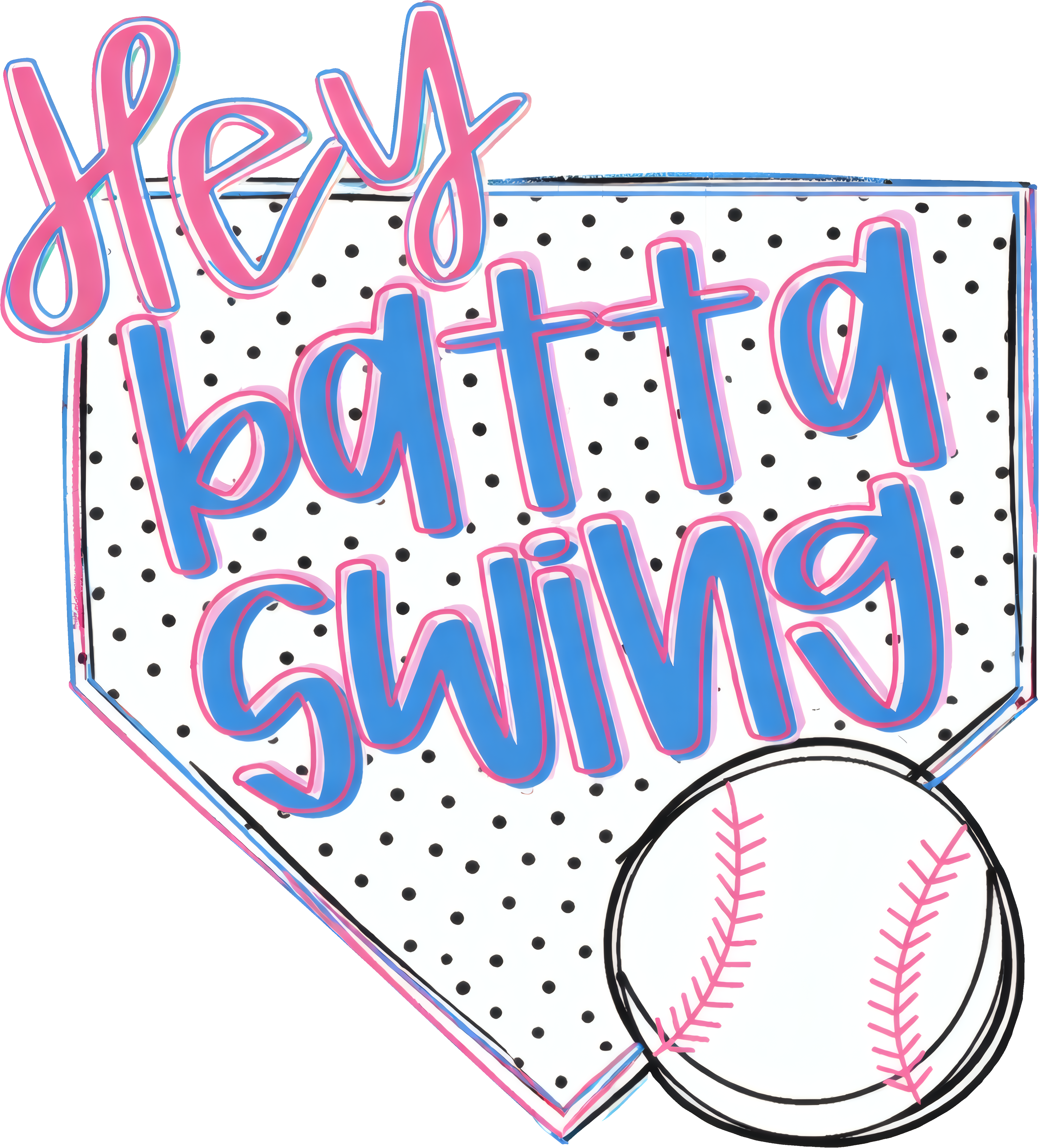 Hit a home run with your apparel collection! This eye-catching DTF transfer brings a playful, nostalgic energy to the diamond. Featuring a bold "Hey Batta Swing" script in bright pink and blue, layered over a classic polka-dot home plate and a hand-drawn baseball, it’s the ultimate "Game Day" look.
