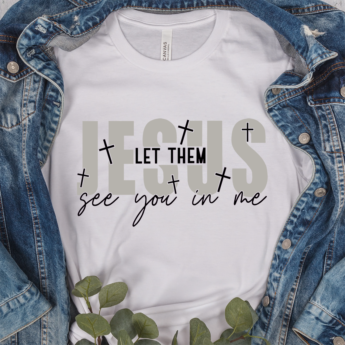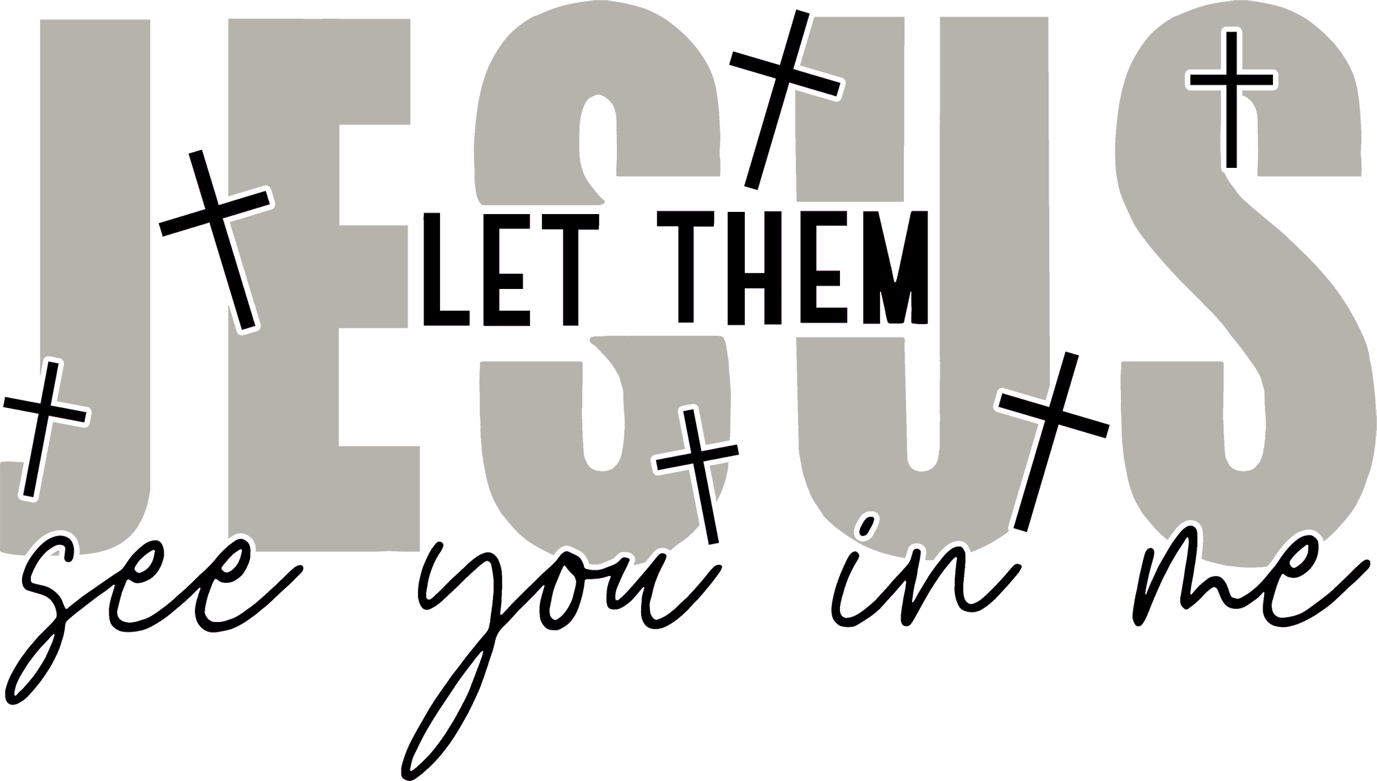 Make a statement of faith that is both bold and humble with this stunning new design. It features the name "JESUS" in large, soft grey block letters as the foundation, overlaid with the powerful request: "LET THEM see you in me" in a mix of modern sans-serif and elegant script fonts.