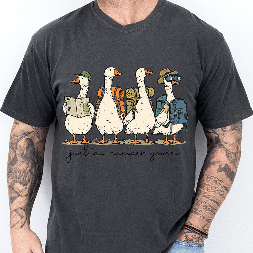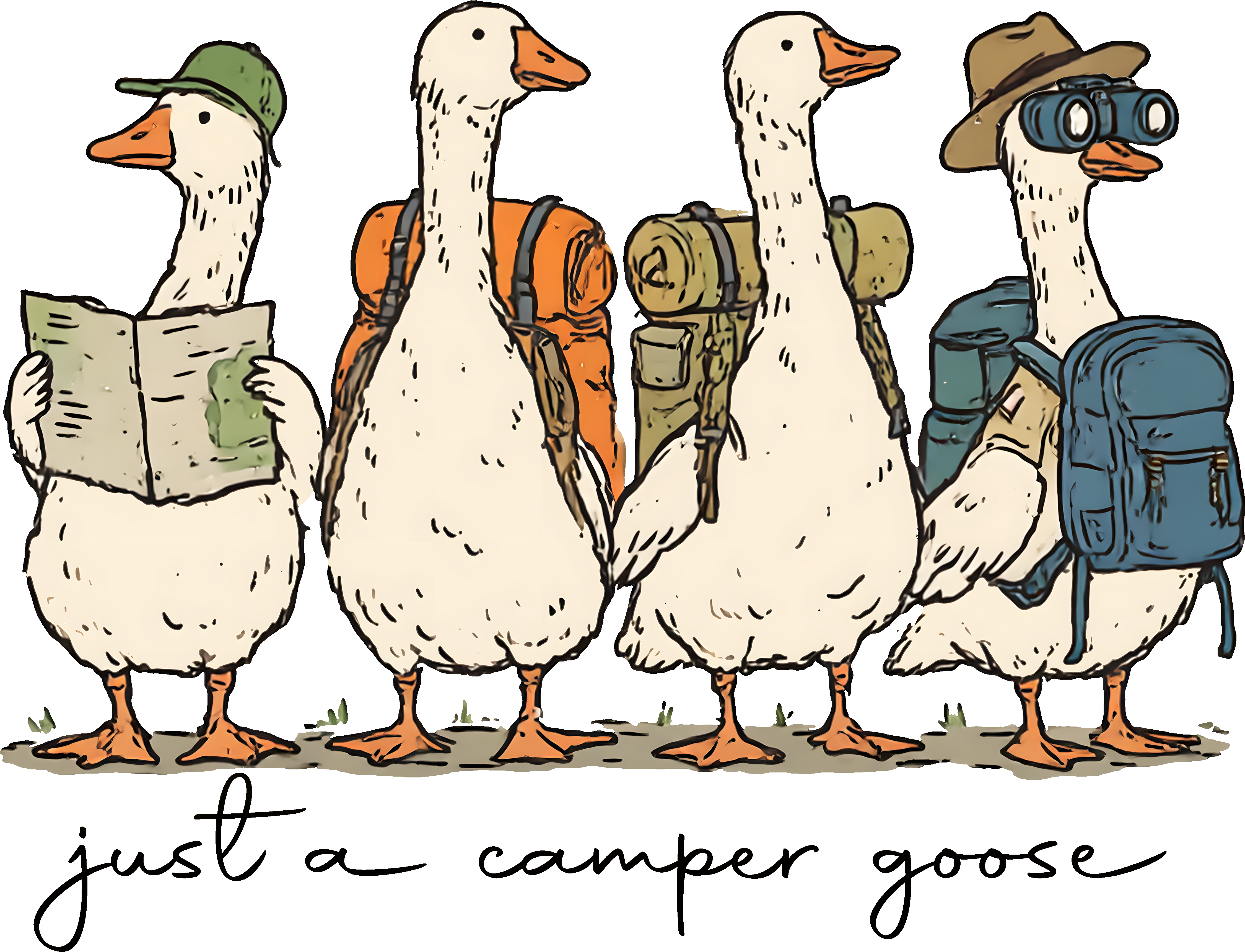 The Perfect Blend of Outdoor Adventure and Humor Embrace the great outdoors with a touch of vintage-inspired charm. Our Just a Camper Goose DTF transfer features a humorous illustration of four geese fully equipped for the trails—complete with backpacks, a map, binoculars, and camping gear. Paired with a stylish, handwritten-style text, this design is the ideal choice for hikers, campers, and nature lovers who want to showcase their adventurous side with a fun, boutique-ready look.