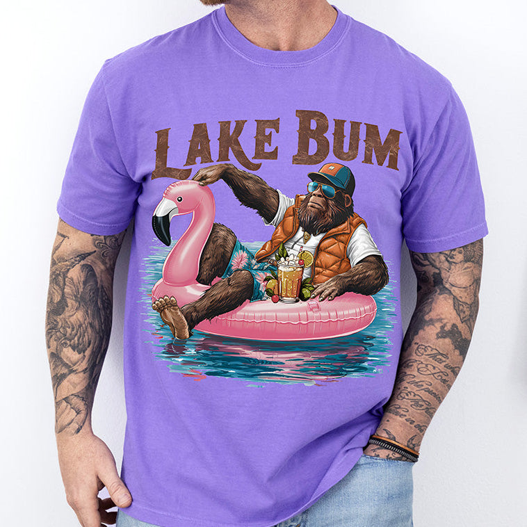 The Perfect Blend of Mythical Humor and Summer Relaxation Upgrade your weekend lake apparel with an eye-catching, comedic twist. Our Lake Bum Bigfoot DTF transfer features everyone's favorite cryptid living his best life—lounging in a bright pink flamingo pool float, sporting sunglasses, a trucker hat, floral swim trunks, and an orange vest, all while holding a tropical beverage. Framed by distressed, rustic "LAKE BUM" typography, this design is the ideal choice for boaters, cabin goers, and outdoor enthusiasts who want to showcase their humor with a high-end, retail-ready look.