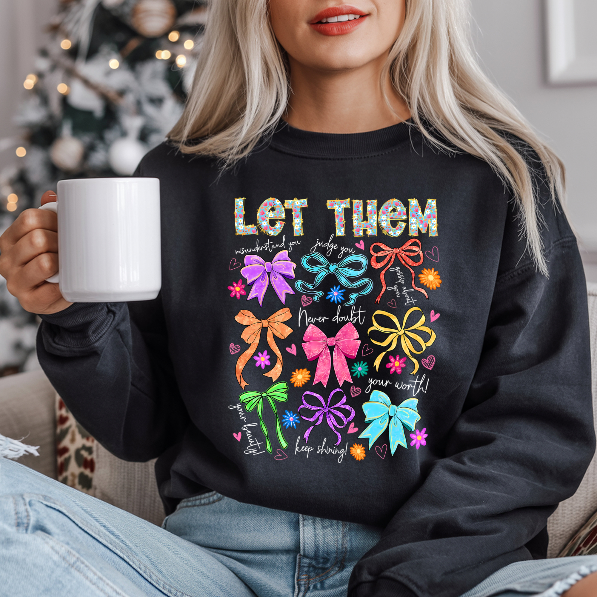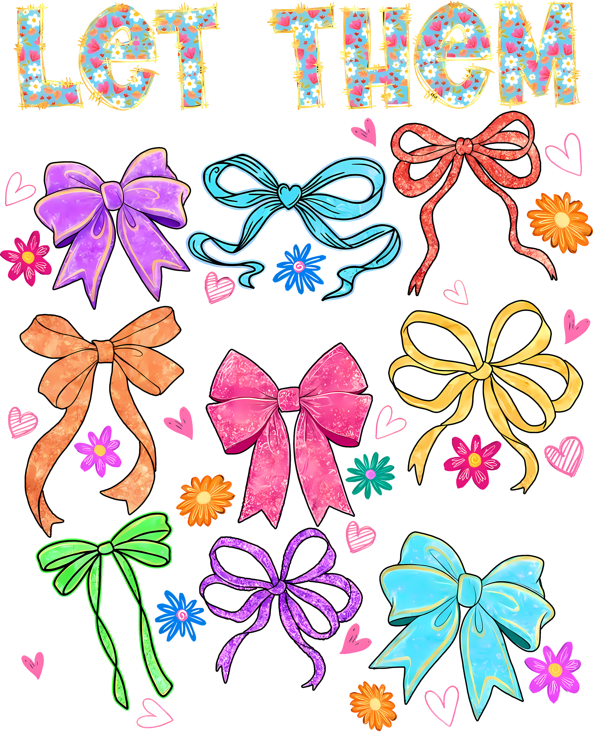Why pick one bow when you can have them all? This stunning transfer takes the viral "Let Them" trend to the next level with a design packed full of color and detail. The headline "LET THEM" features a cute blue and pink floral pattern, sitting above a collection of gorgeous bows in every color of the rainbow—teal, glittery pink, textured red, sunny yellow, and royal purple!