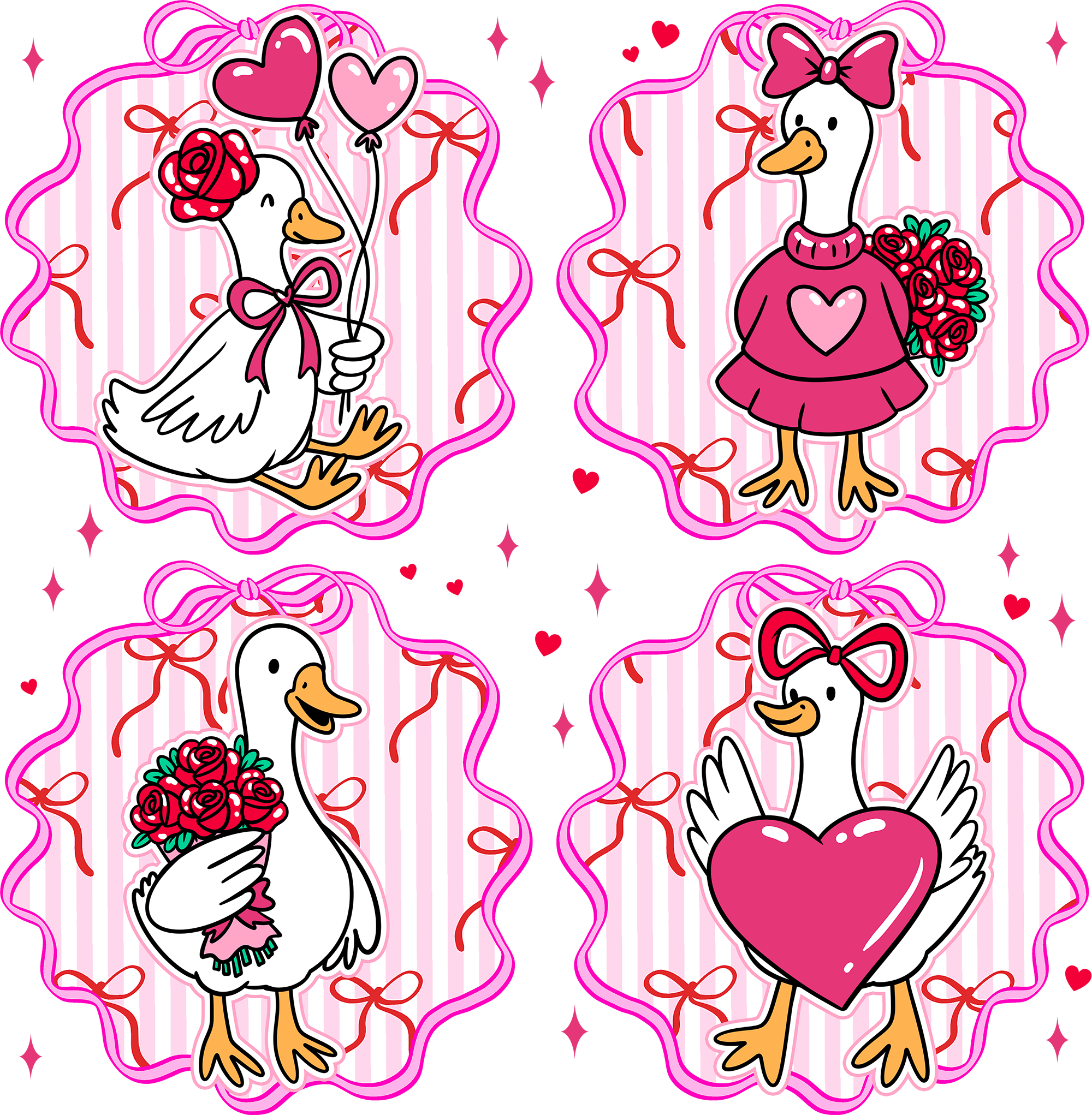 Get ready for the sweetest waddle of the season with our "Lucky Duck Valentine" DTF transfer set! This design features four absolutely precious white ducks (or geese!) dressed to impress for Valentine's Day. Each character is framed by a coquette-style pink scalloped border with dainty bows and stripes.