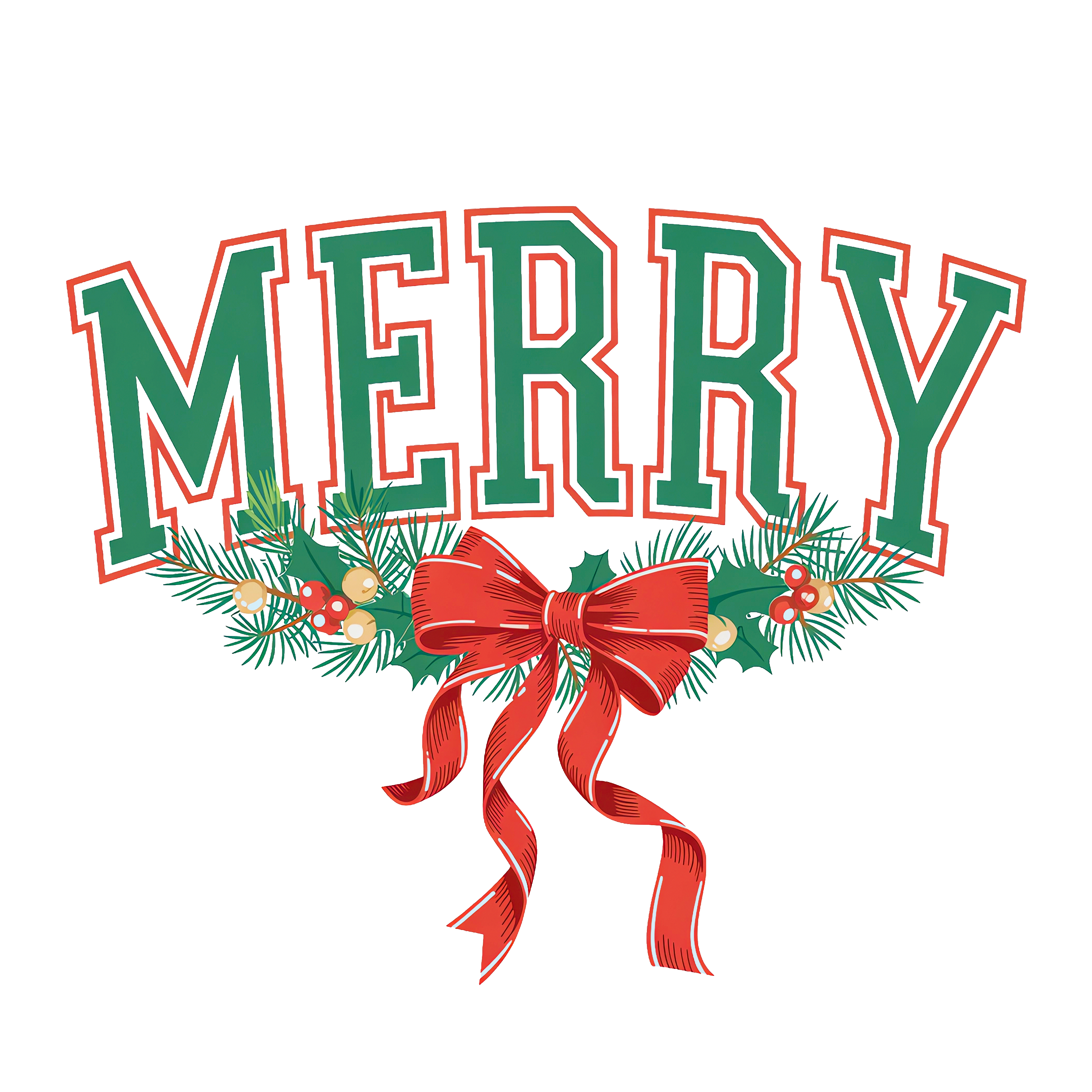 This design features bold, varsity-style lettering in a perfect holiday green, elegantly draped over a stunning arrangement of pine, holly, and a gorgeous red bow. Itβs a sophisticated and spirited choice for creating everything from cozy sweatshirts to festive gameday tees this holiday season.