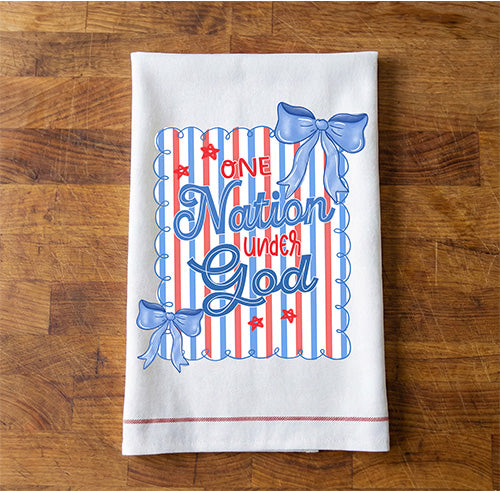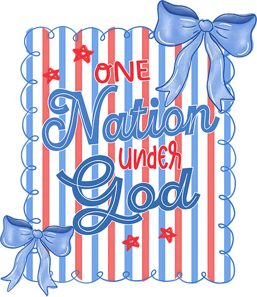 Framed by a cute scalloped blue doodle border, the design showcases the phrase "ONE Nation under God" in a fun mix of block and script lettering. And for the finishing touch? Two lovely cornflower blue bows perched on the corners and cute little red stars scattered throughout! It’s the perfect blend of faith, freedom, and fashion.