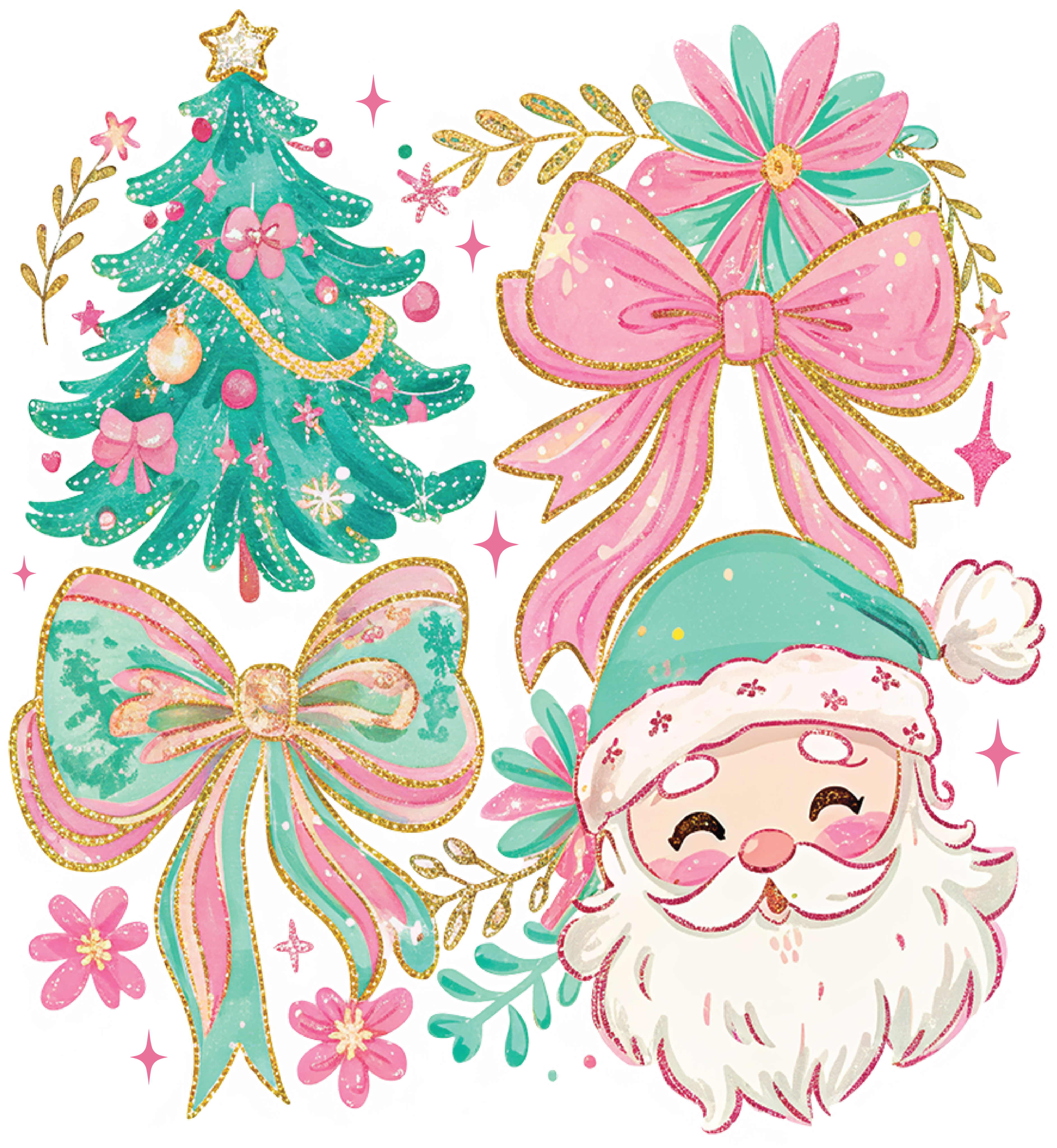 This adorable design features a jolly Santa rocking a mint-green hat, surrounded by sparkling Christmas trees, vibrant florals, and—of course—stunning oversized bows dripping in gold glitter accents. It’s the perfect mix of sweet, sassy, and festive!