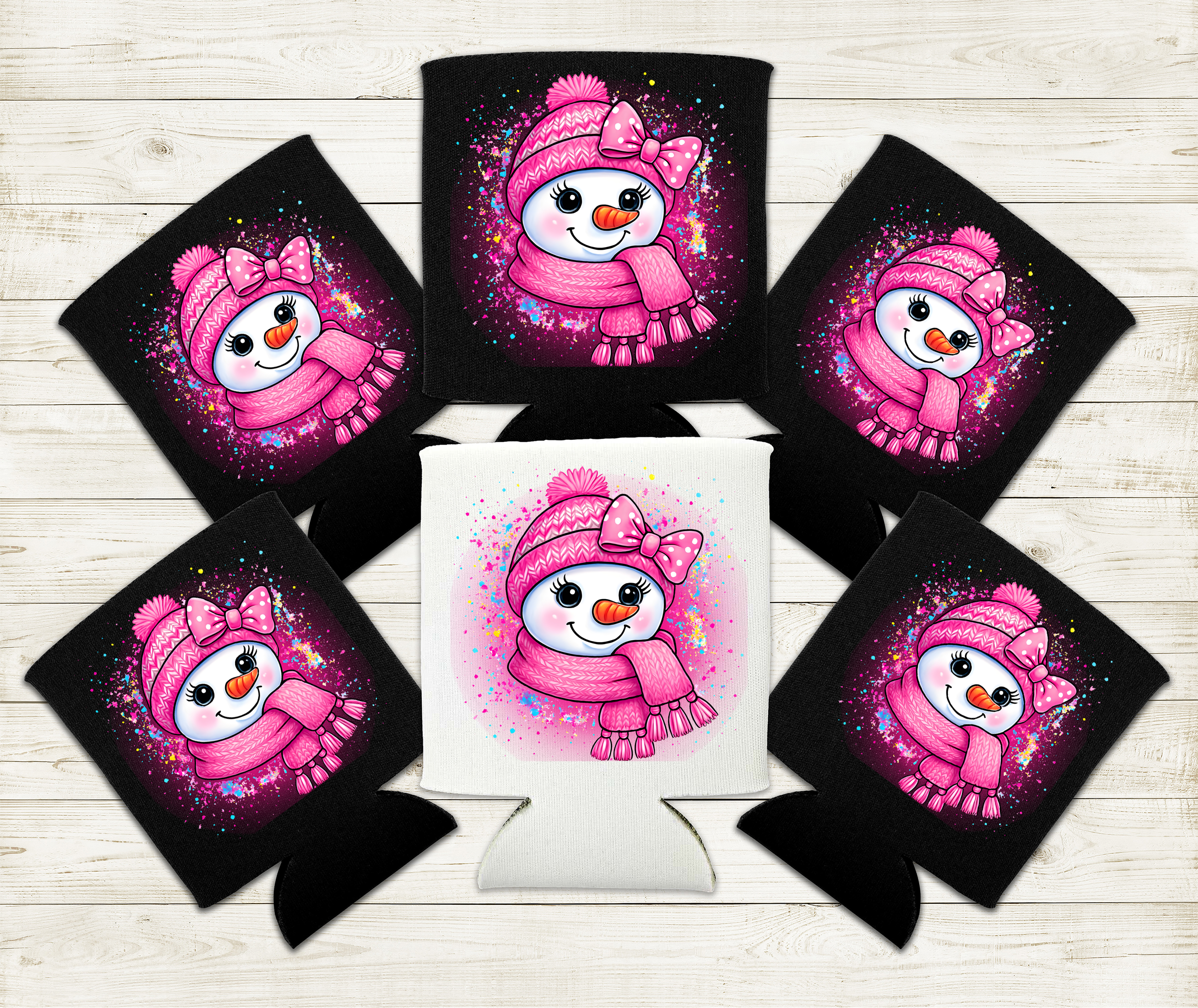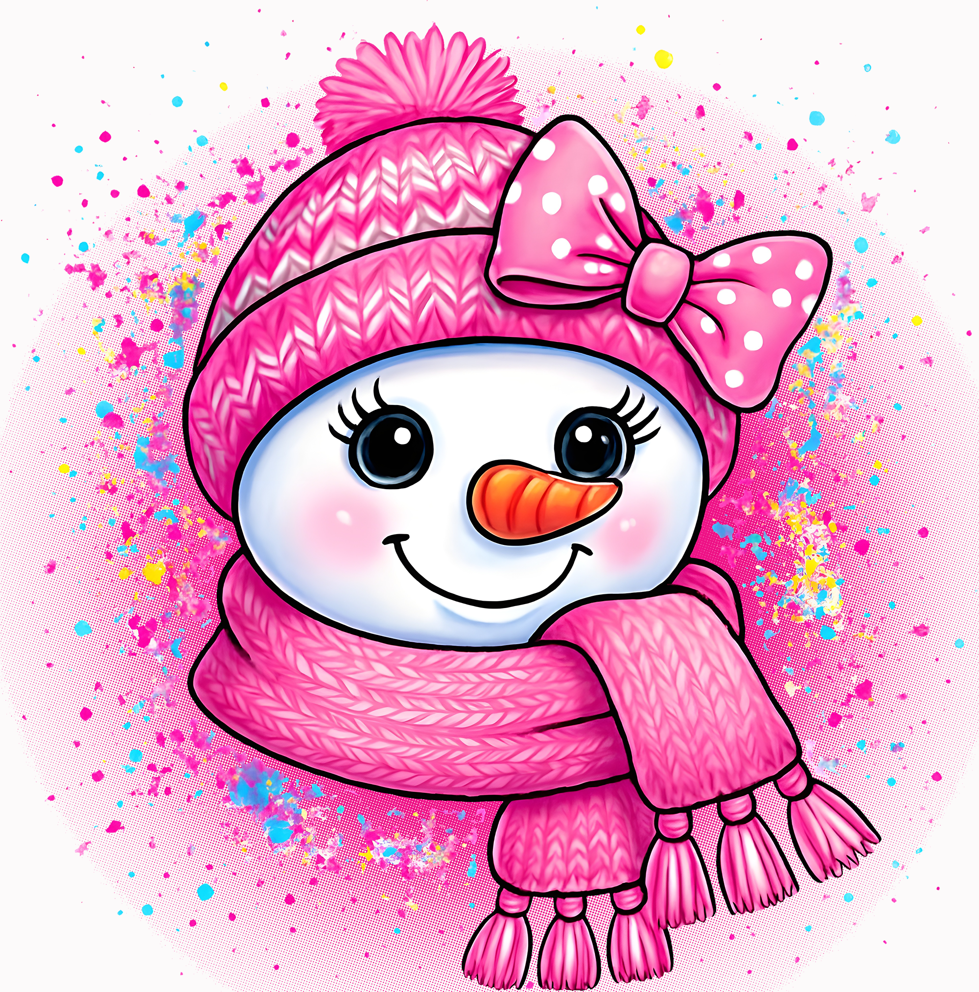 This adorable design features a beaming snowman face wrapped up in a cozy, realistic-looking pink knit hat and scarf. Topped off with a sassy polka-dot bow and surrounded by a splash of colorful confetti and paint splatters, this design is pure joy.