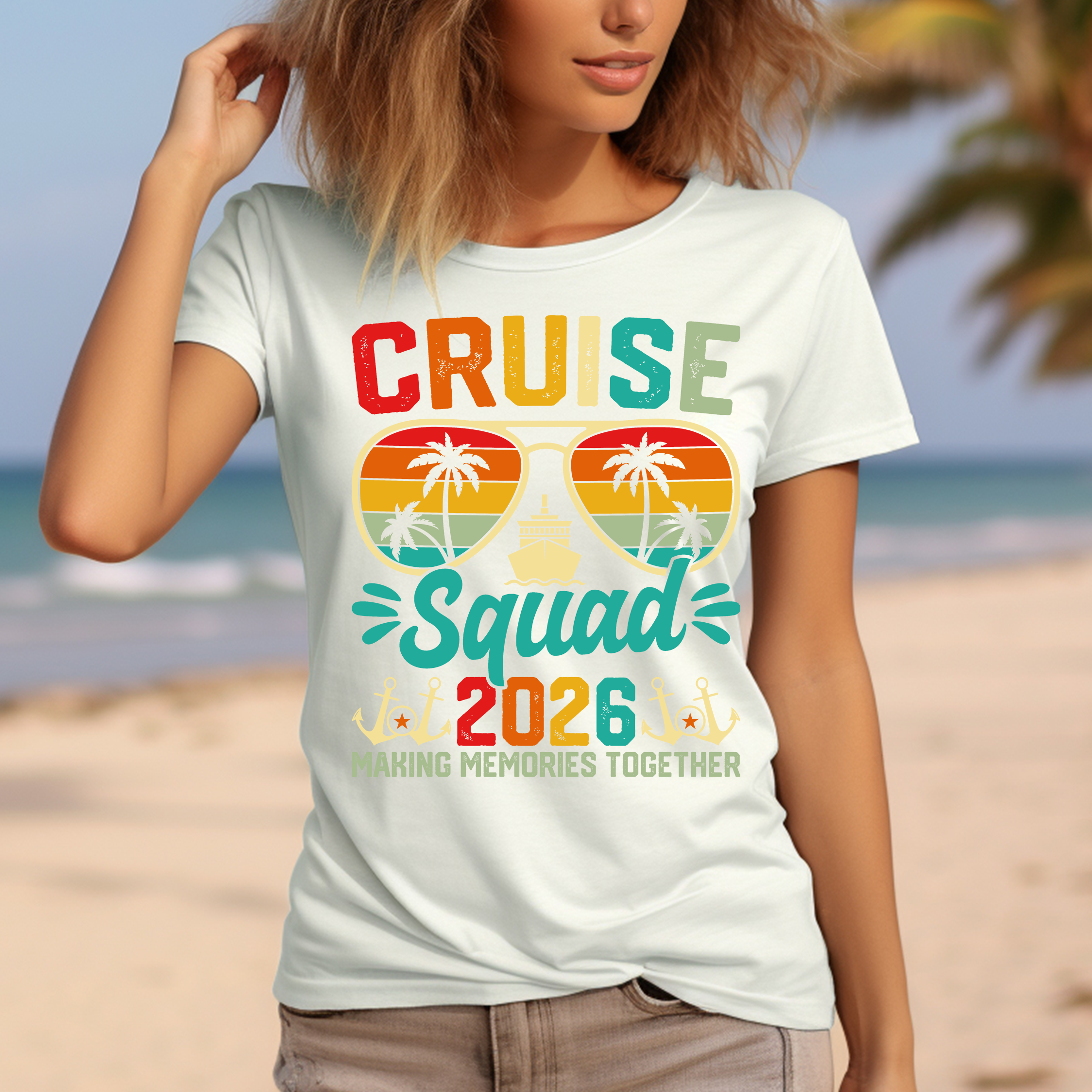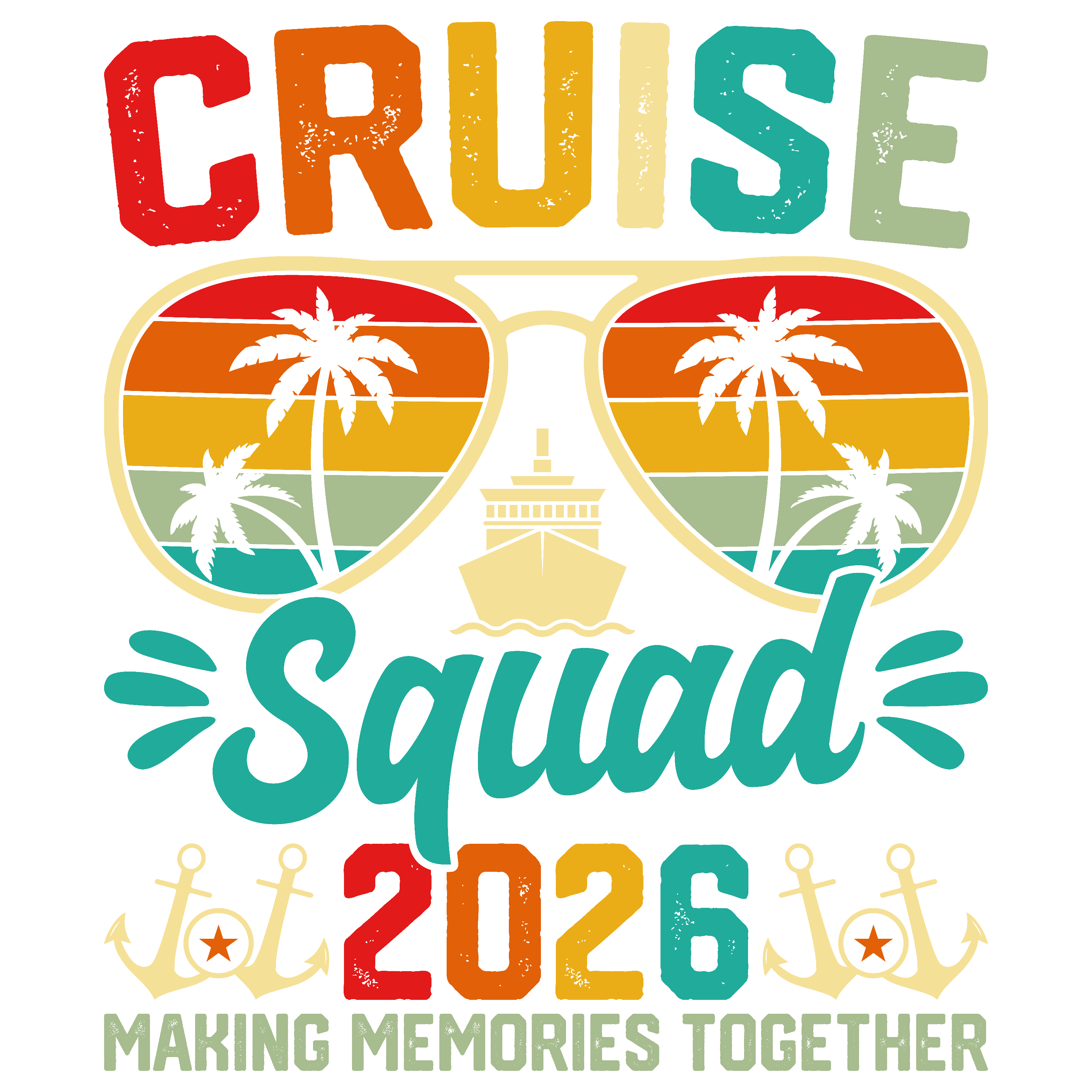 The ultimate group vacation deserves the ultimate matching gear, and our retro "Cruise Squad 2026" heat transfer is ready to set sail. With its cool, distressed vibe, vibrant sunset colors, and tropical sunglasses, this design is the perfect way to unite your crew and kick off an unforgettable adventure.