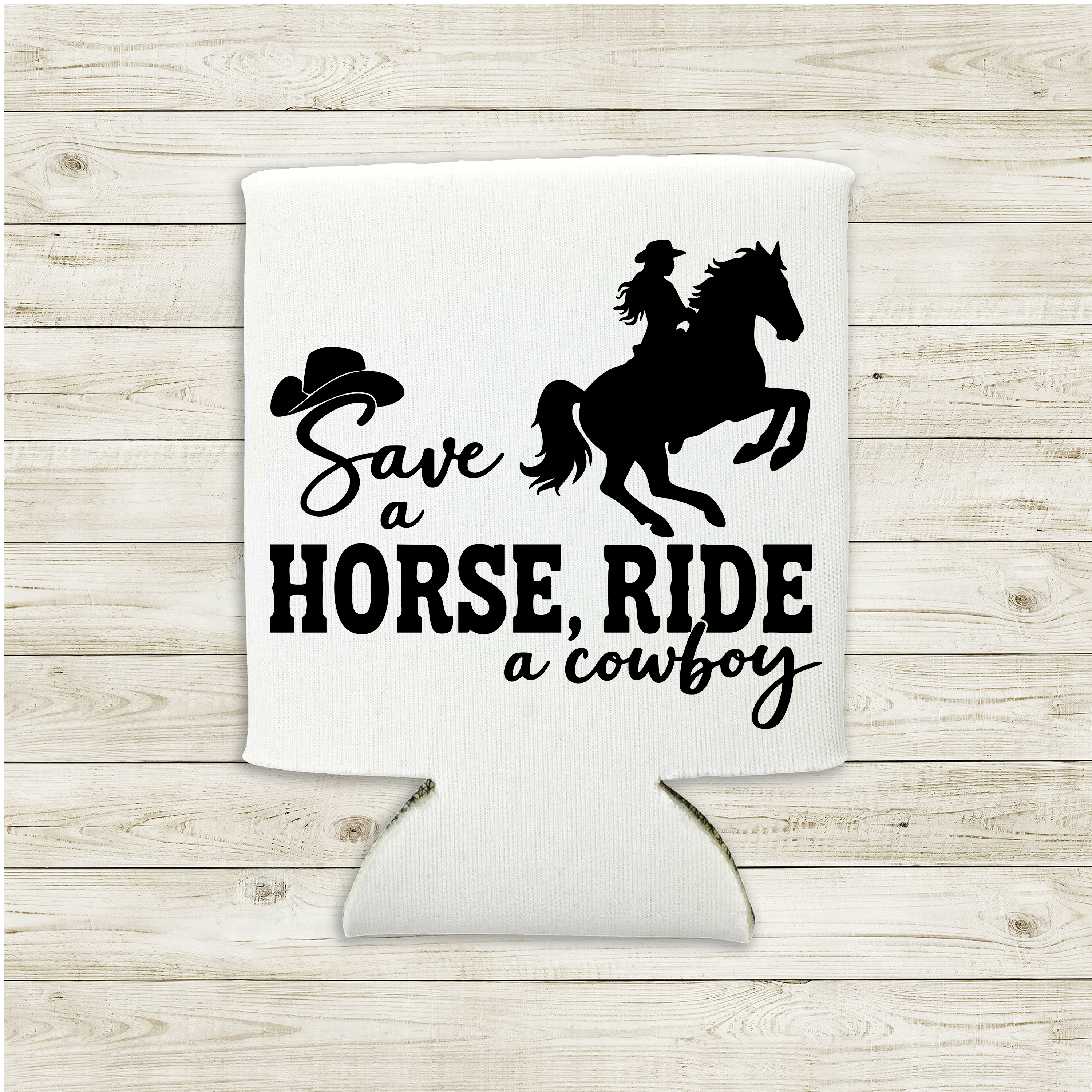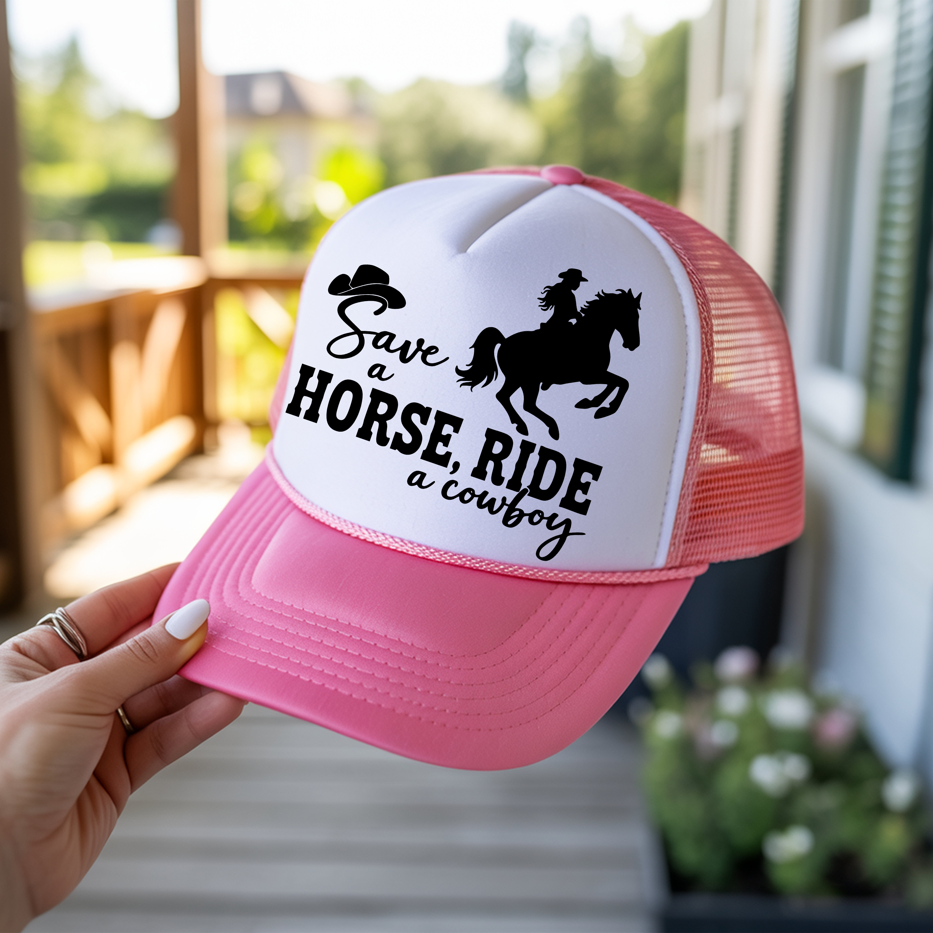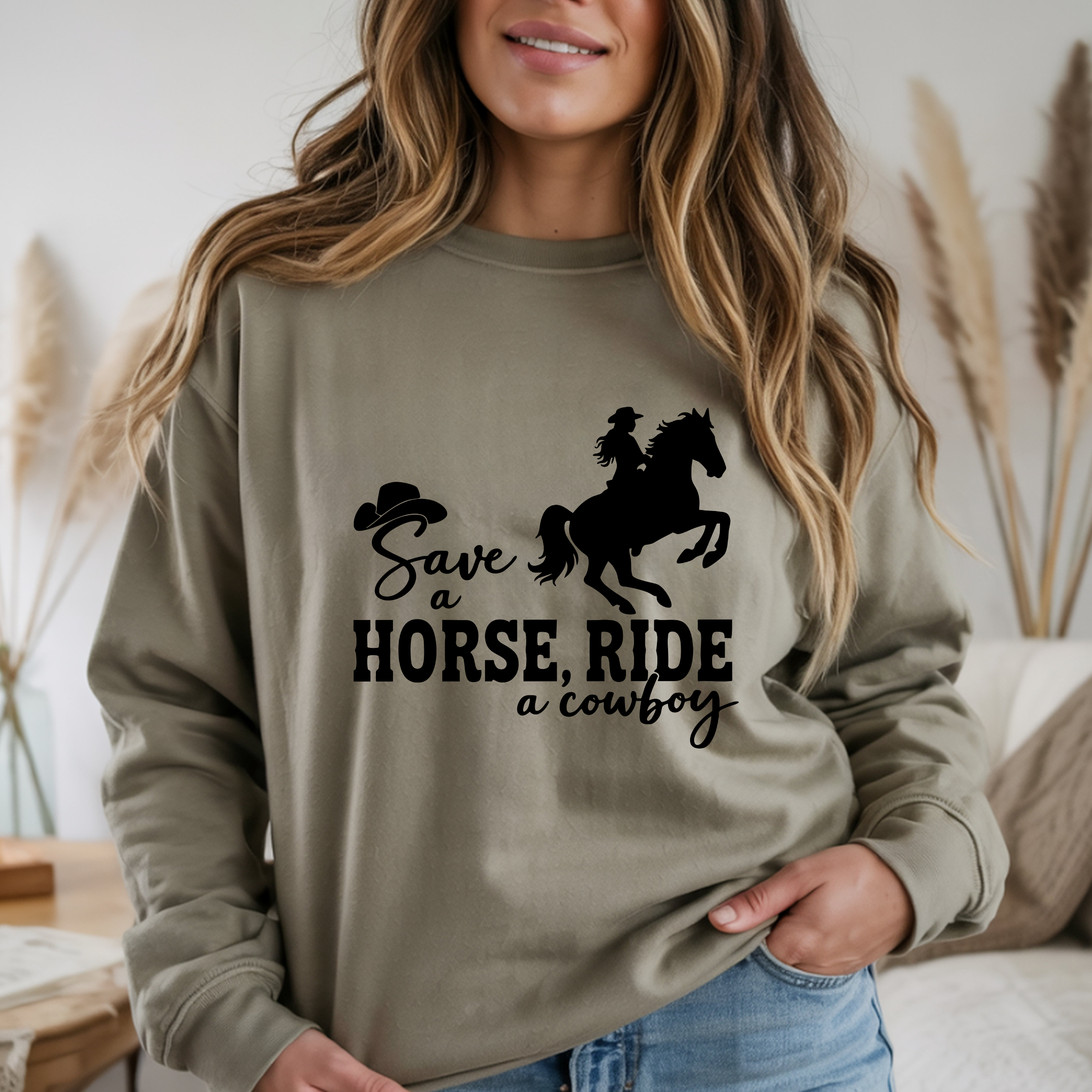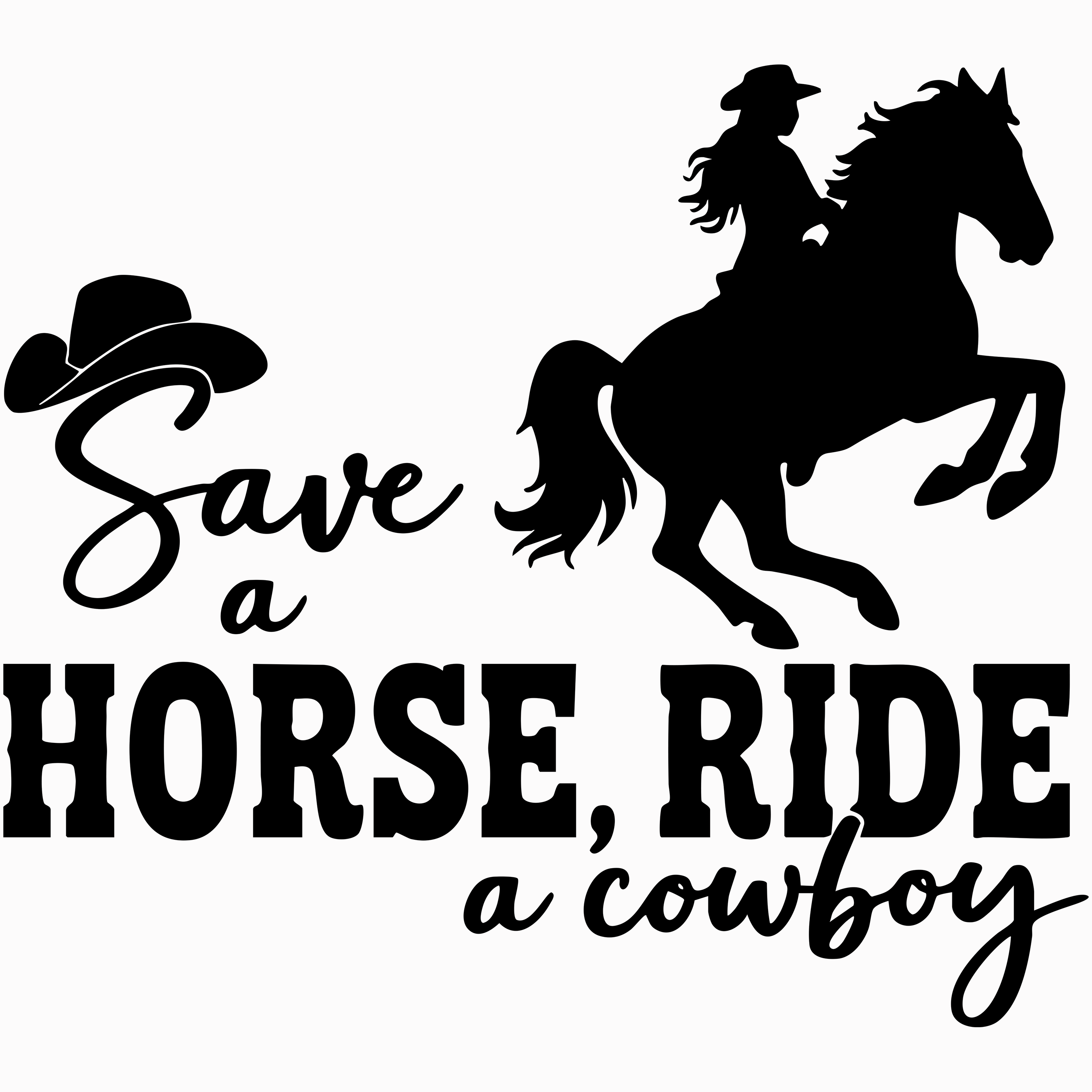 Get ready to make a statement with this iconic and flirty, ready-to-press DTF transfer. It features the legendary phrase "Save a Horse, Ride a Cowboy" in a mix of bold and scripty western fonts. Accented with a cowboy hat and a rearing cowgirl silhouette, this design is pure honky-tonk perfection!