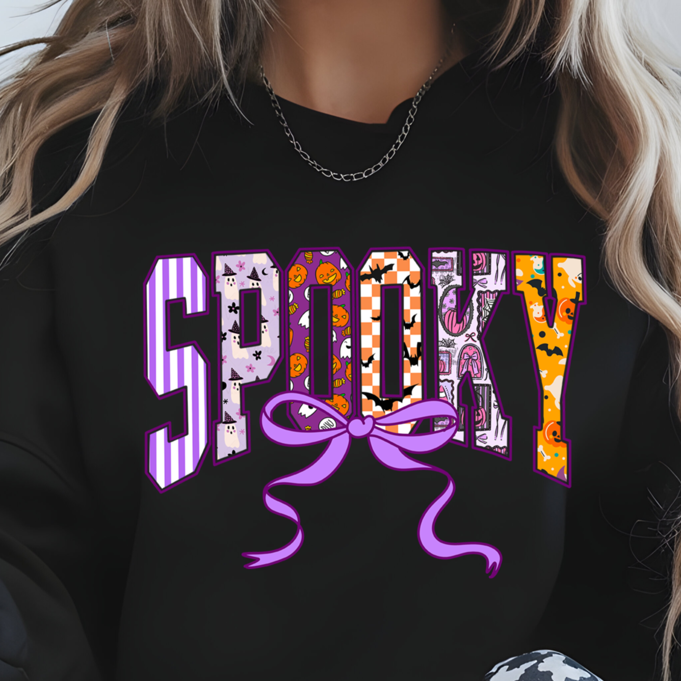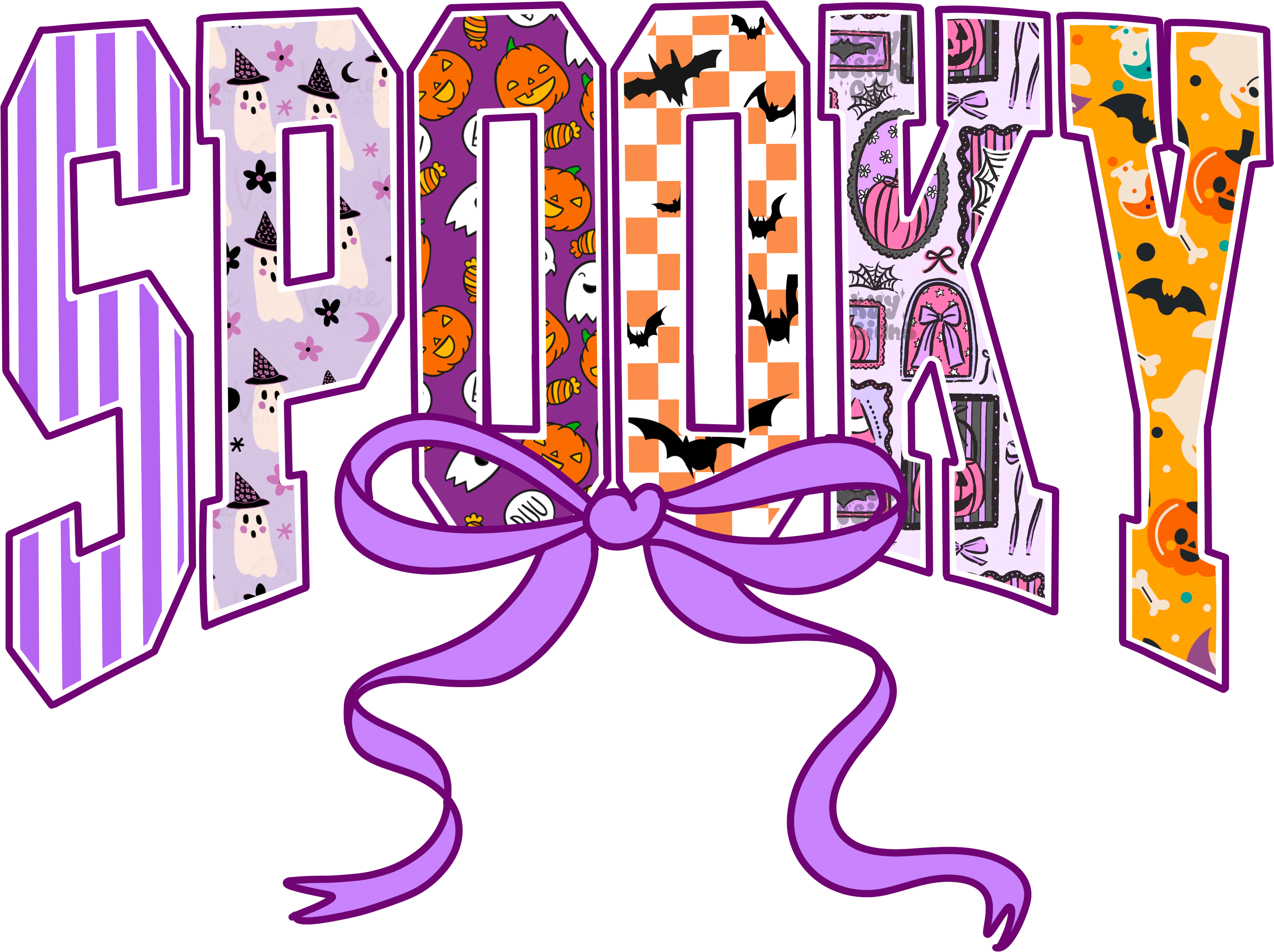 Our "Spooky" DTF transfer is the perfect blend of playful patterns and Halloween fun, all wrapped up with a charming lavender bow. Each letter is a mini-masterpiece, filled with friendly ghosts in witch hats, cheerful pumpkins, and stylish checkerboard bats. It's the ideal choice for anyone who loves a colorful, cute, and girly aesthetic for Halloween.