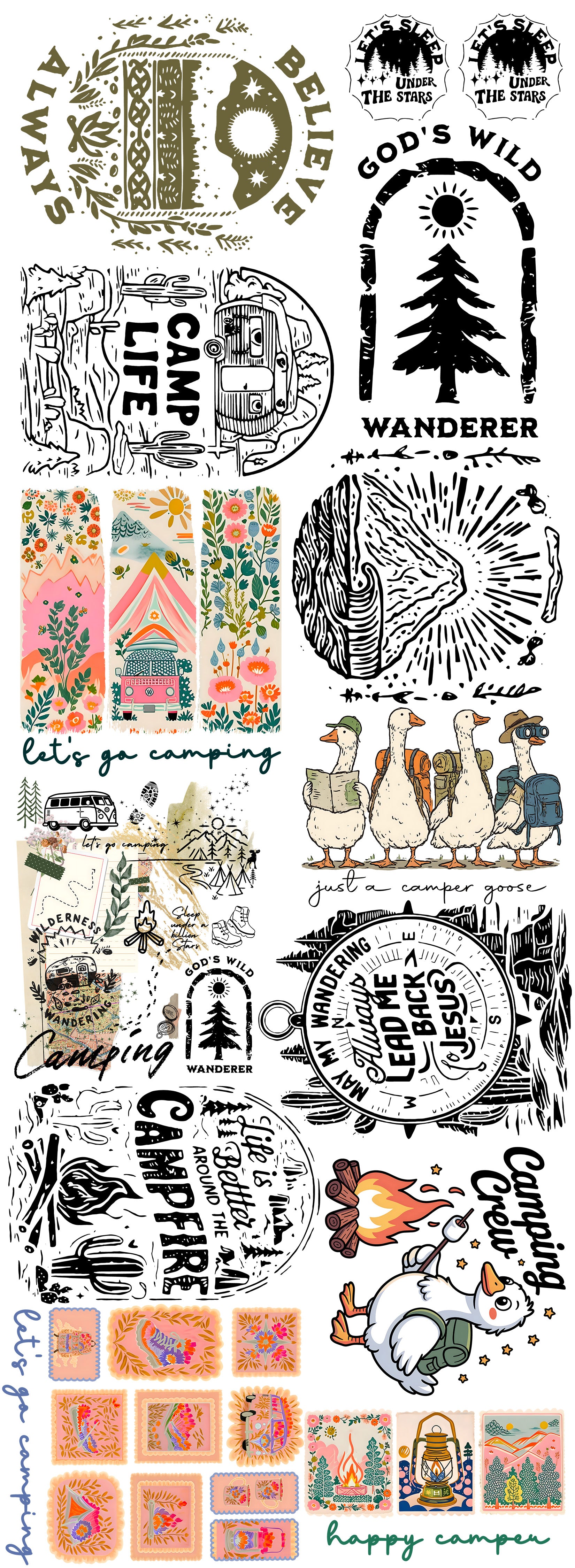 Vintage Vibes: Retro "Camp Life" desert scenes with classic trailers, and pastel floral camping collages perfect for a boho outdoor look.