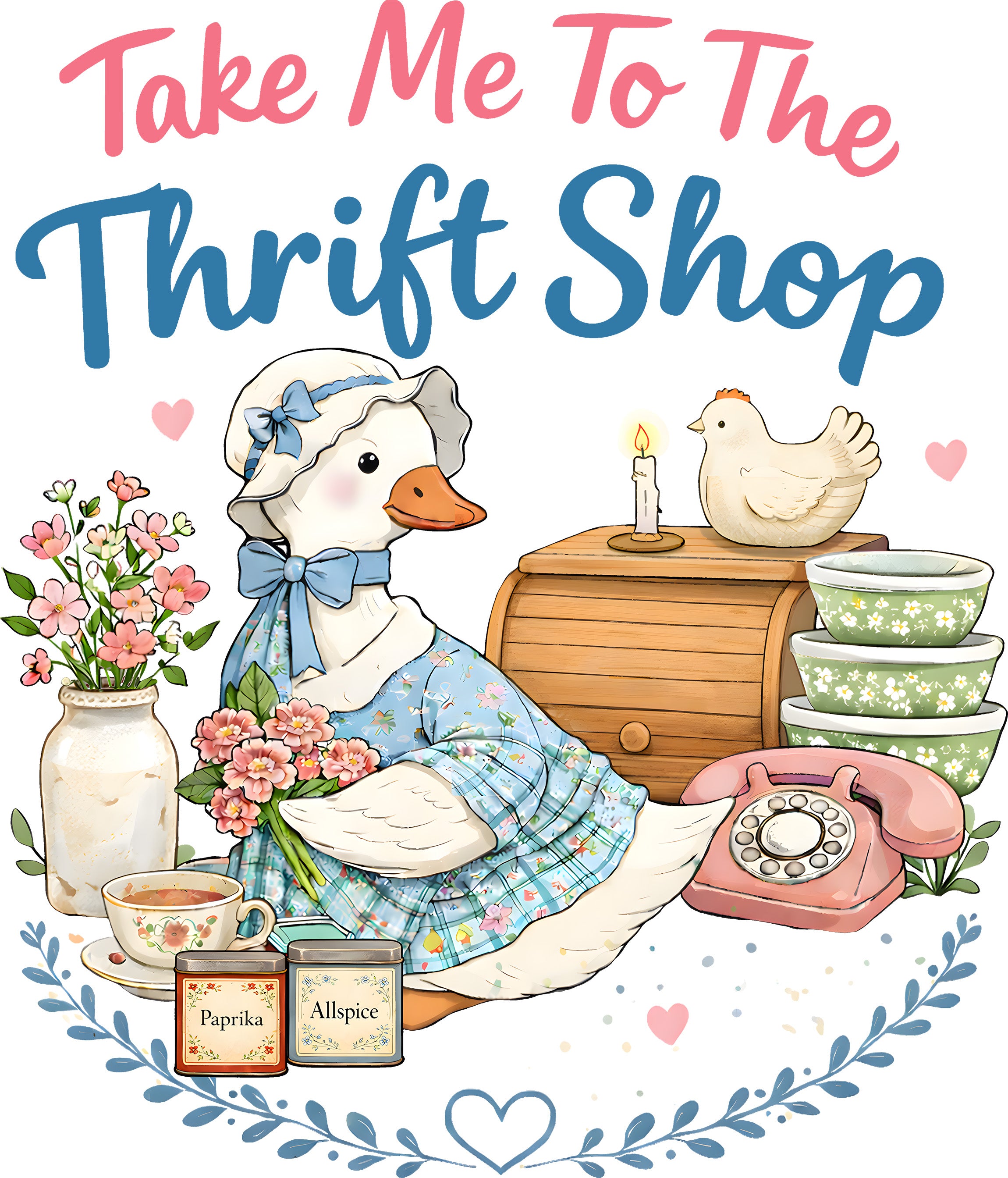 Calling all vintage lovers and secondhand superstars! 🛒 Our "Take Me To The Thrift Shop" transfer is a whimsical tribute to the thrill of the hunt. Featuring an adorable cottagecore duck surrounded by retro treasures like Pyrex bowls, a rotary phone, and vintage spice tins, this design is pure nostalgia. As a Crystal’s Besties exclusive, you won't find this charming feathered friend anywhere else!