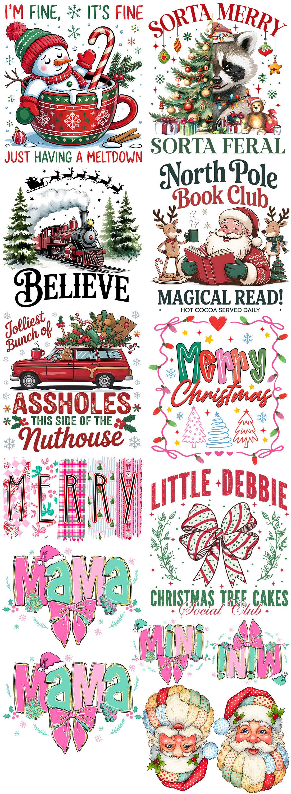 This isn't just one transfer; it's a whole workshop on a sheet! You get an incredible variety of ready-to-press designs, from the hilarious "I'm Fine, It's Fine" melting snowman and the "Jolliest Bunch of Assholes" station wagon to the super-sweet "Christmas Tree Cakes Social Club" and trendy "Mama" & "Mini" sets. Plus, you'll find timeless "Believe" designs and "Family Christmas 2025" transfers to make this year extra special!
