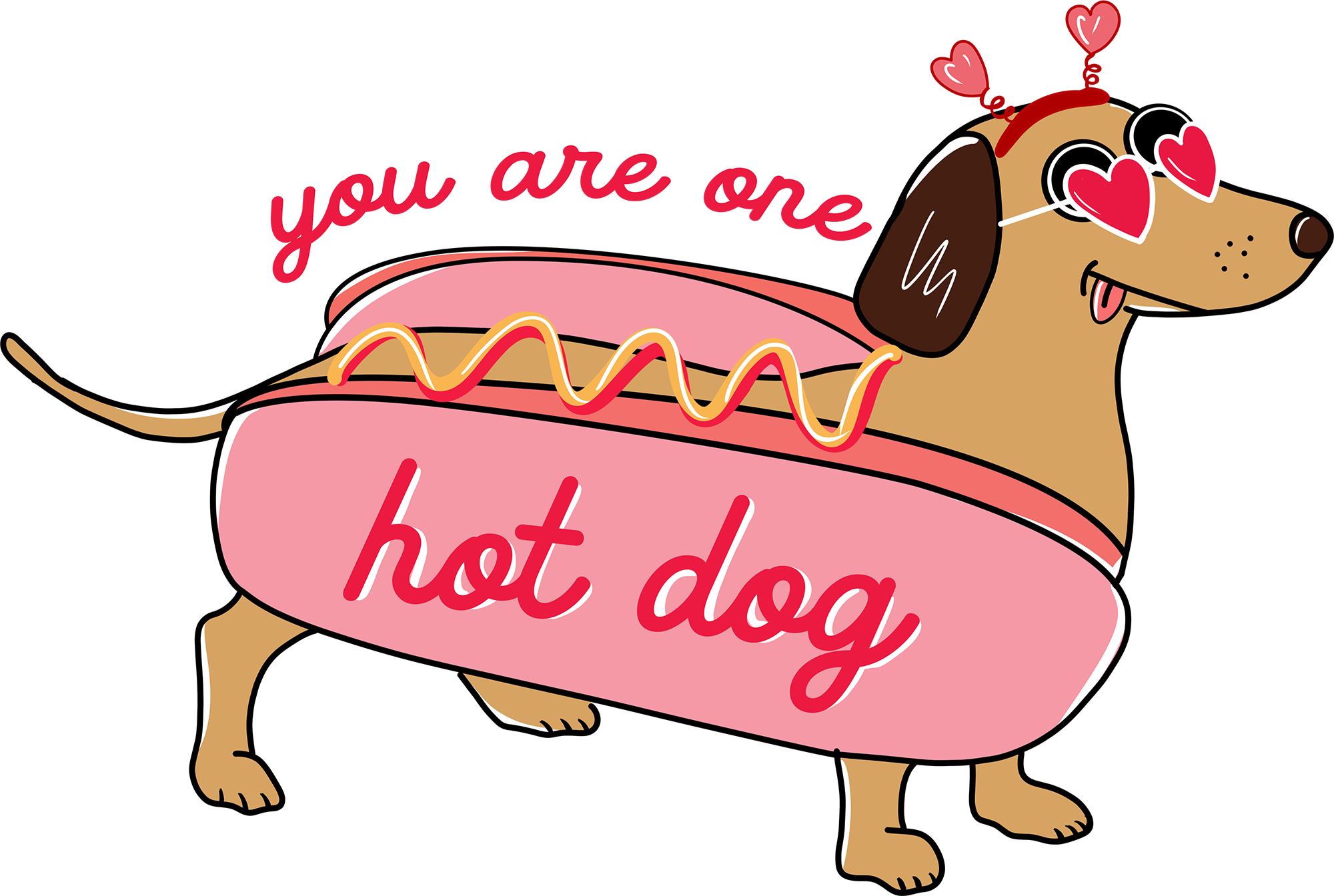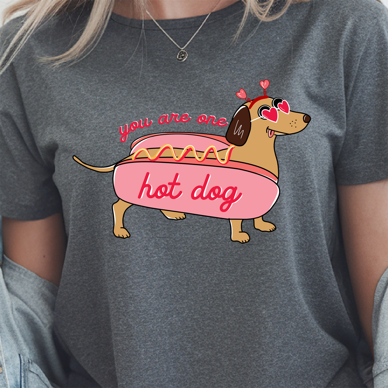 Serve up some smiles with our hilarious "You Are One Hot Dog" DTF transfer! This design is the ultimate treat for dog lovers and pun enthusiasts alike. It features an adorable dachshund strutting his stuff in a pink hot dog bun costume, topped with a squiggle of mustard.