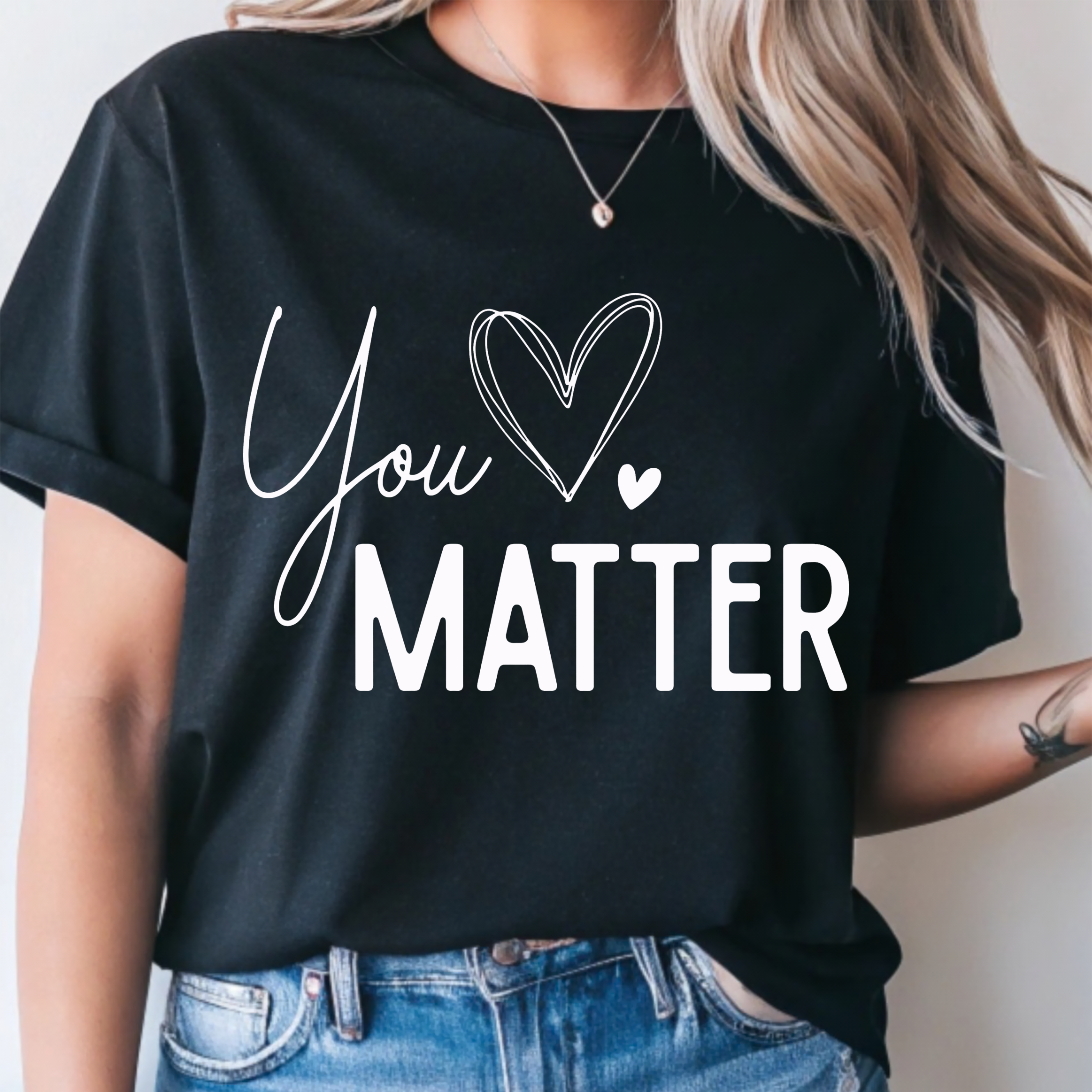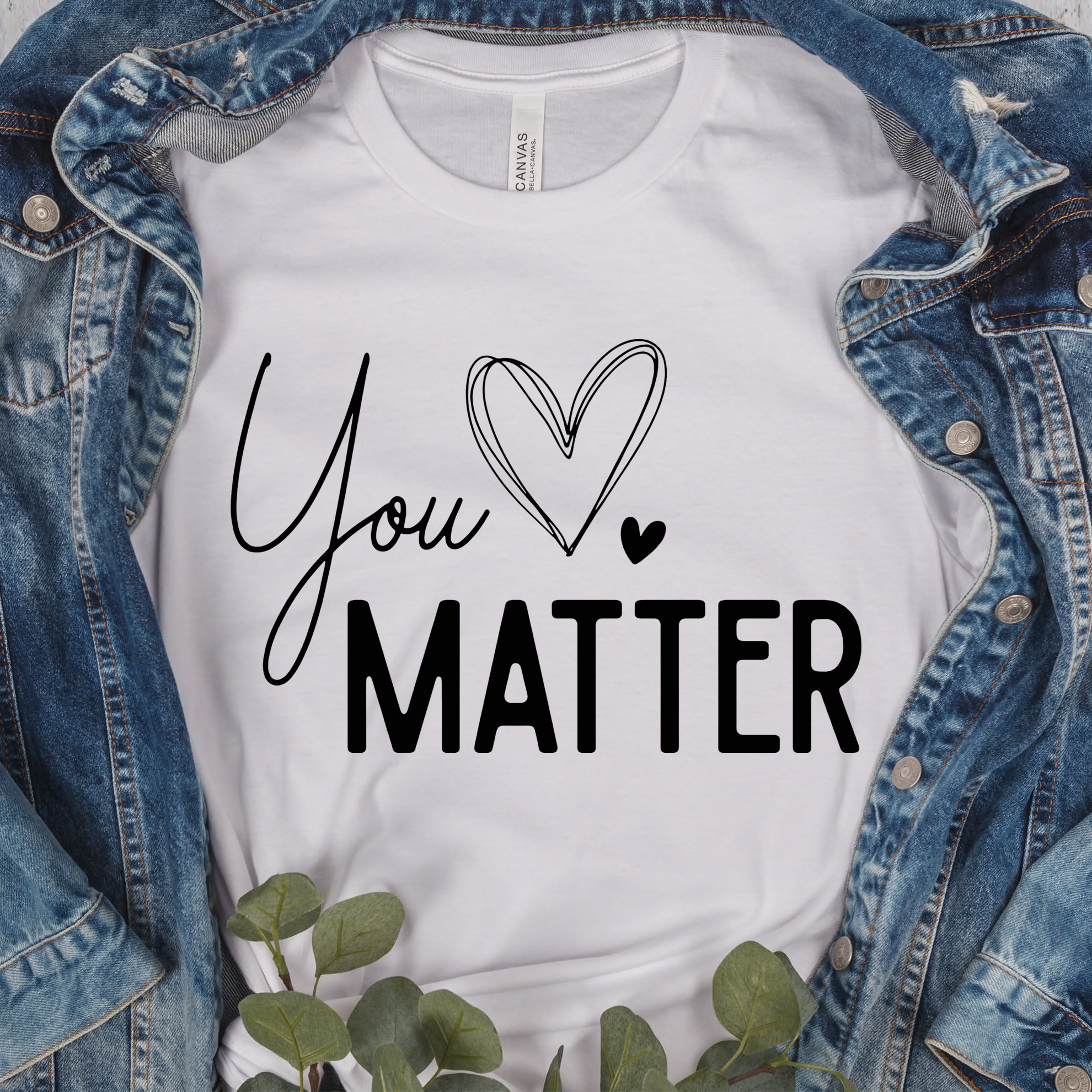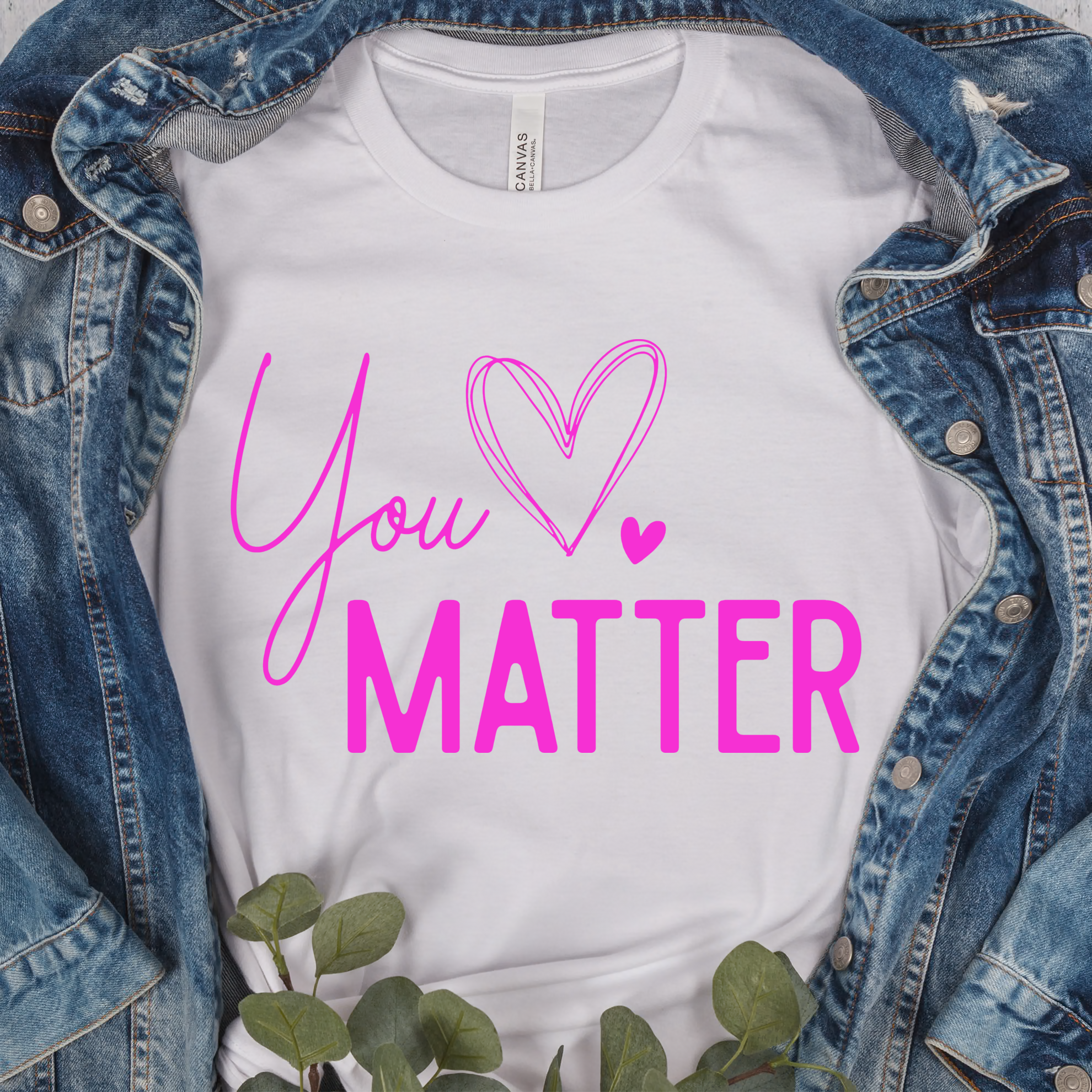 Spread love and kindness with this vibrant and powerful design. Featuring the phrase "You MATTER" in bright, neon pink, this transfer combines a flowing script font with bold block letters for a modern look.