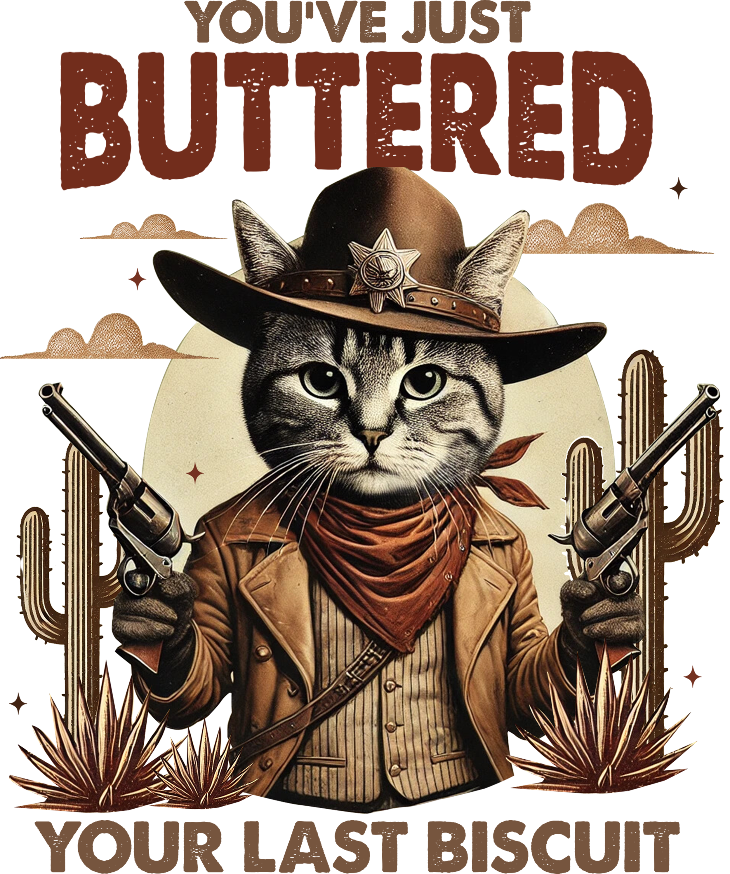 Featuring a finely detailed tabby cat decked out in a classic cowboy hat, sheriff's badge, bandana, and a dapper waistcoat, flanked by trusty revolvers and desert cacti, this ready-to-press transfer is an instant hit. It's purr-fect for creating unique t-shirts, hoodies, or even a statement tote bag that'll make everyone say "Meowdy!"